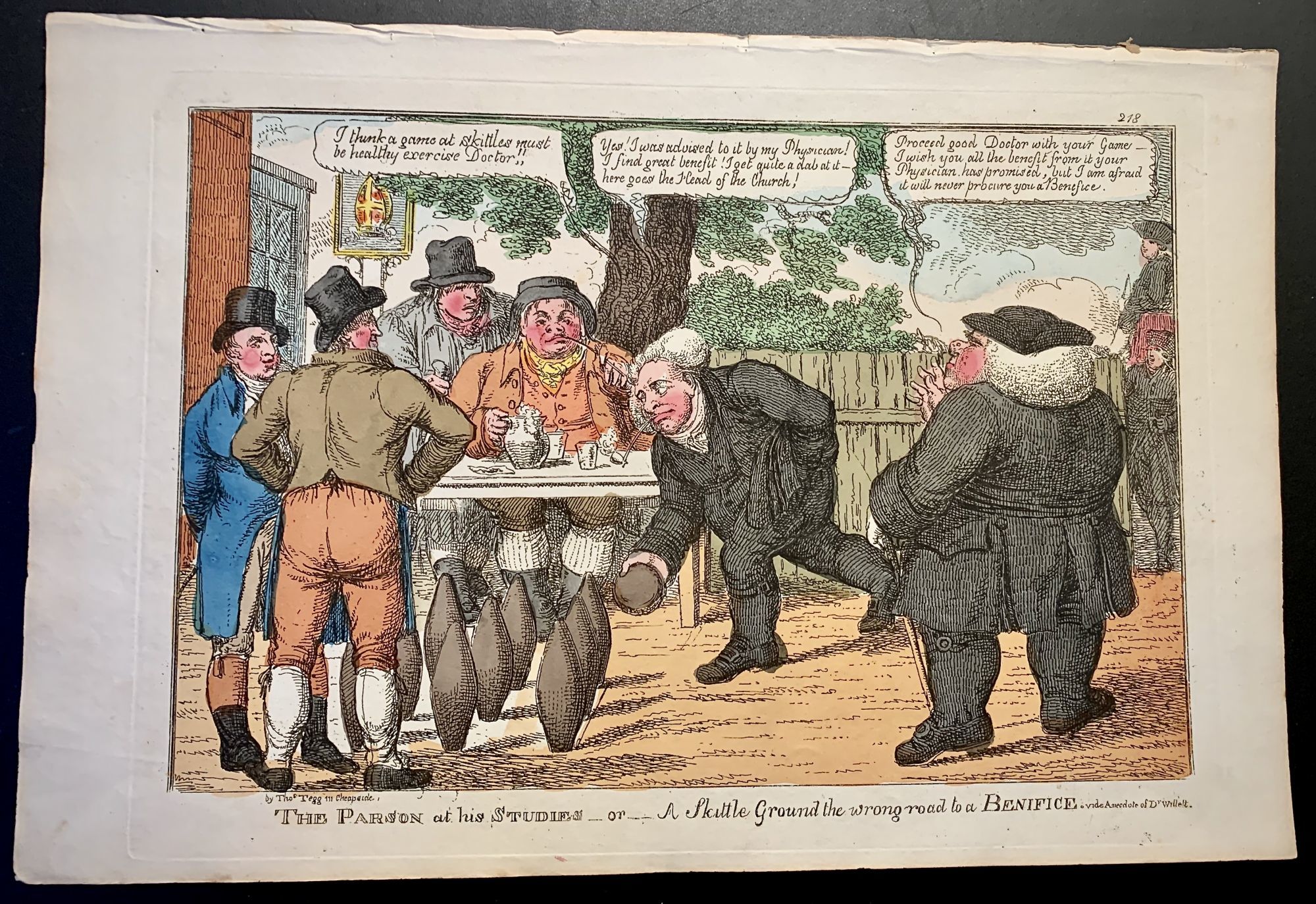 London: Thomas Tegg, 1819. Wraps. Very Good. Wiiliams, Charles. 27 X 40 cm. Etching with hand coloring. 1819 watermark. The fellow with pipe says, " I think a game of skittles must be healthy exercise Doctor." Doctor: "Yes, Twas advised to it by my Physician! I find great benefit ! I get quite a dab of it -- here goes the Head of the Church ! Large man at far right, "Proceed good Doctor with your game -- I wish you all the benefit from it your Physician has promised, but I am afraid it will never procure you a Benefice." Top margin a bit frayed.