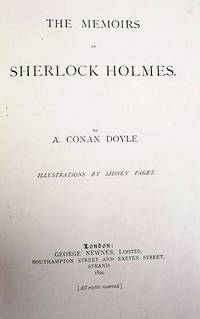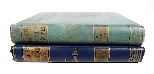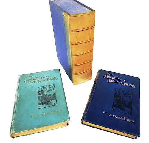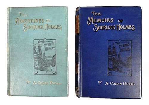London: George Newnes Limited, 1892 and 1894. First Edition. Hardcover. The ADVENTURES has a previous owner's name in ink dated 1892 on the front endpaper, scattered light foxing, hinges cracked with the front cover a little loose and a couple of places in the text where there is some separation and looseness of the signatures; some moderate rubbing to the spine, a scratch on the front panel with the gilt fairly bright. Very Good. MEMOIRS has an 1896 owner name on the recto of the frontispiece, clean text throughout, hinges slightly cracked; some mild rubbing to the spine, covers clean with very bright gilt. Near Fine. Clamshell box with the backstrip sunned and minor wear. Overall a Very Good set. Sidney Paget. Two large octavo (6-1/4" x 9-1/2") volumes: original light blue beveled cloth, front and spine stamped in black and gold, all edges gilt, floral patterned endpapers; original dark blue beveled cloth, front and spine stamped in black and gold, all edges gilt, floral patterned endpapers; [1-4,] [1], 2-317, [318: printers imprint], [319-320: blank] pages; [1-6], [1], 2-279, [280: blank] pages. First Issue of ADVENTURES in the correct first state binding with "cucaine" on page 133 and "Violent" on page 317. These two volumes collect the first 23 short stories featuring Sherlock Holmes and Dr. Watson, starting with "A Scandal in Bohemia" and ending with "The Final Problem." Glover & Greene, VICTORIAN DETECTIVE FICTION #128 & #129; Green and Gibson, A10 and A14: "Rarely has a character so quickly established itself on the popular imagination as did Sherlock Holmes in the latter half of 1891"; Haycraft-Queen Cornerstone. Queen's Quorum #16 (ADVENTURES); Keating, CRIME & MYSTERY: THE BEST 100 BOOKS (ADVENTURES). Housed in a custom blue half morocco and blue cloth clamshell box with a gilt-lettered spine.