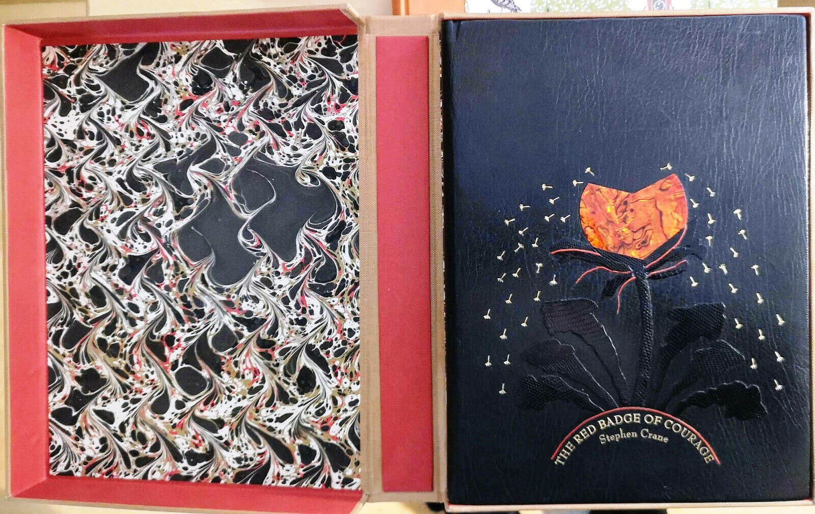(London): The Land Press, (1988). First Edition. Hardcover. Fine in a close to Fine clamshell box with a minor bump at the bottom corners. Quarto (8-1/2" x 11-3/4") bound by Constance K. Wozny in a striking full black morocco leather art binding with onlays depicting a poppy weeping seeds of tears, tan morocco pastedowns, and marbled endpapers. Illustrated with 11 collotype illustrations from contemporary Civil War photographs by Alexander Gardner, Timothy O'Sullivan, and others from the Library of Congress collection chosen to illustrate the mood of the scenes described in the book. One of the illustrations is bound in at the beginning of the text; the other ten are loose in a glassine envelope. Copy #94 of 140 printed by Gwasg Gregynog, SIGNED by the binder and dated 2011 on the colophon page. The Land Press published this edition of Crane's classic in a choice of five bindings designed by Denise Lubbett, Angela James, Romilly Saumarez Smith, and Jen Lindsay. This appears to have been an unbound copy that was privately bound at a later date (2011) by Wozny, a member of the Guild of Book Workers and the Hand Bookbinders of California. Housed in a custom cloth clamshell box