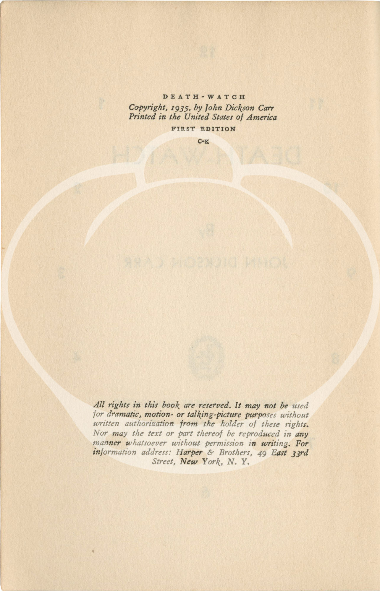 New York: Harper and Brothers, 1935. First Edition. First Edition. The fifth book in John Dickson Carr's Gideon Fell mystery series, preceded by "The Blind Barber" and followed by "The Hollow Man."