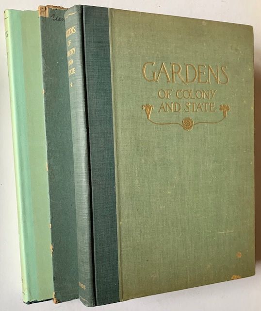 New York: Charles Scribner's Sons, 1934. Cloth. Very Good +/Very Good +. A handsome example of the 2 volume set, the 1931 AND 1934 1st editions together. Both volumes solid and VG to VG+ in their duotone cloth (dark and light-green), with bright gilt-titling to the front panels and spines. Very light spotting and staining to Vol. I's front panel, very light foxing to its preliminaries. Vol. II sharp and very presentable, in a clean, bright example of the uncommon dustjacket. The dustjacket is solid and VG+, with light offsetting to the panels and just a touch of very mild chipping along the edges. Also included with Vol. II is the fragile printed slipcase, which shows wear along the edges and staining to the pasted-on paper title but is nonetheless attractive and serviceable Folios, hundreds of crisp black-and-white photos throughout. Compiled ane edited for the Garden Club of America by Alice G.B. Lockwood. This copy signed by and from the personal library of Sean Sculley (1939-2021), renowned architect and landscape designer and long-term professor at New York's Cooper Union.