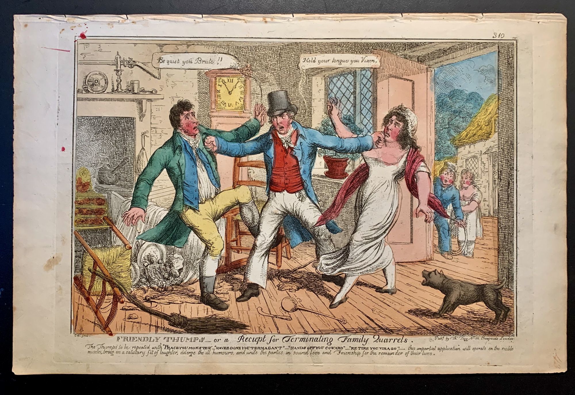 London: Thomas Tegg, 1822. Wraps. Very Good. Wiiliams, Charles. 25 x 40.5 cm. Hand colored etching. 1822 watermark. Text below title: "The Thumps to be repeated with 'Peace you monster _ Havee done you Termagent (a harsh-tempered or overbearing woman) _ Hands off you coward _ Retire you Verago_ this impartial application will operate on the risible muscles as a salutary fit of laughter, delerge the ill humours, and unite the parties in sound Love and Friendship for the remainder of their lives." Top margin slightly frayed.