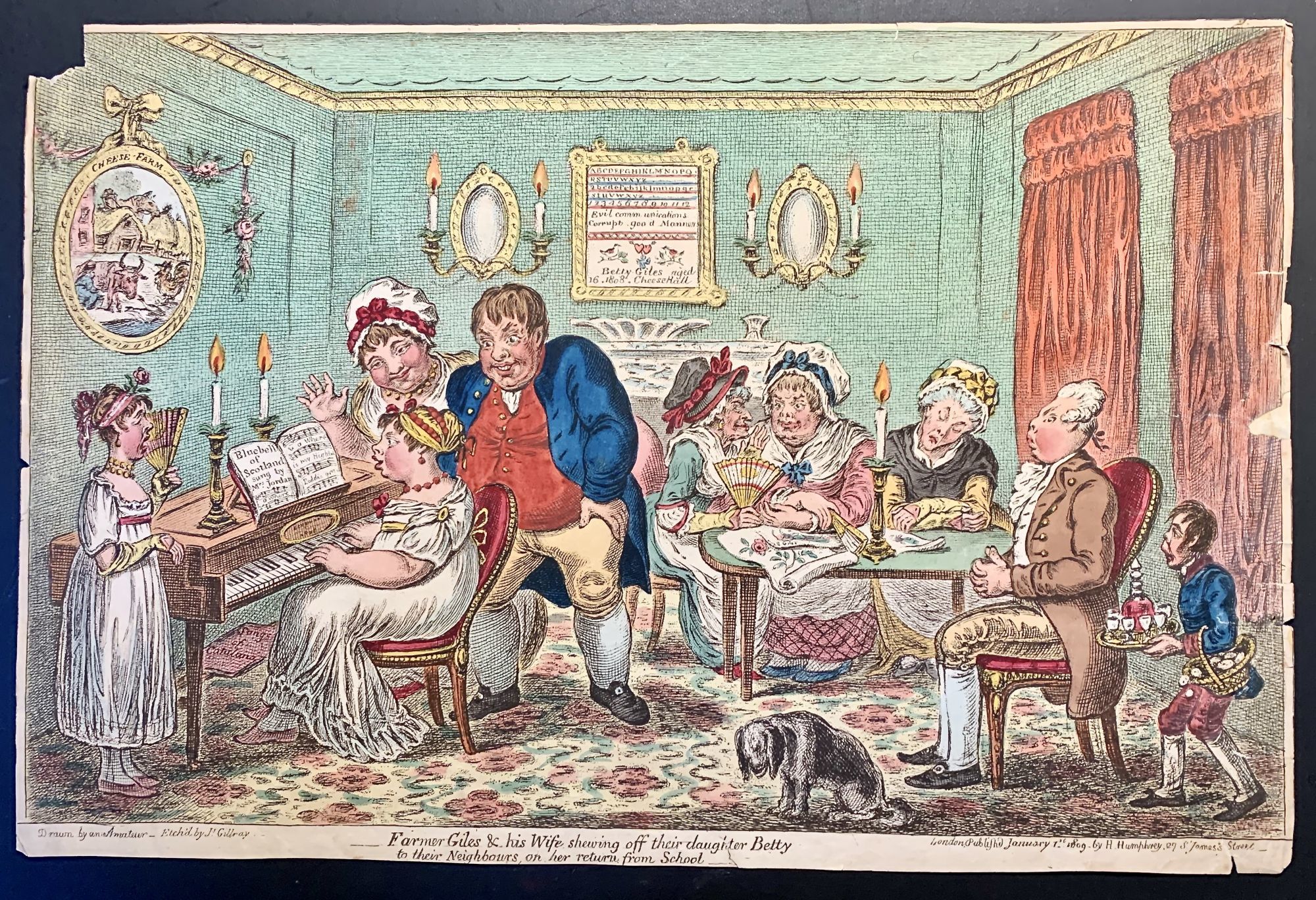 London: Hannah Humphrey, 1809. Wraps. Very good. Gillray, James. 30 x 46 cm. Hand colored etching. A rich farmer's parlour or drawing-room, with curtains drawn over two high windows (right). Lower left corner states, "Drawn by an Amateur Etched by Js Gillray." Bluebell of Scotland, sheet music played and sung by Betty. Wall signboard reads, "Evil communications corrupt good Manners," and below "Betty Giles aged 16. 1808, Cheese Hall." One of the guests twiddles his thumbs, the others pay no attention to the homily on the signboard, and the animal in hang-dog posture. A lad carrying refreshments with the cakes falling out. Lacks small corner at left head, nicks with some loss at right margin.