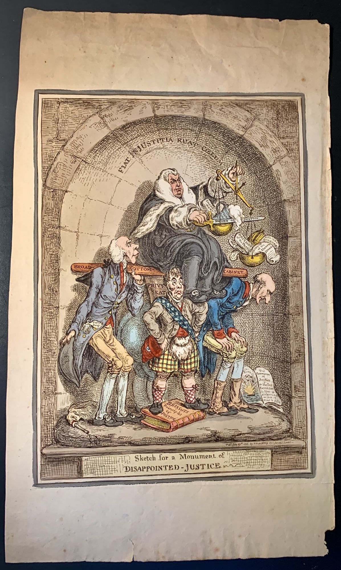 London: Hannah Humphrey, 1806. Wraps. Very good. Gillray, James. 49 x 28.5 cm. Hand colored etching. The figures are placed in an alcove recessed in a wall of heavy stones. The massive Ellenborough in wig and gown sits on a wooden seat or plank supported by Sidmouth, Lauderdale, and Stanhope, with behind, the bent posteriors and massive legs of Grenville, who is otherwise hidden by Lauderdale and by a pan suspended from the seat. This seat is 'Broad-Bottom Cabinet' the pan (shaped like that of a commode) is 'Privy Seat'. Wide top and bottom margins, top margin slightly browned, small nicks right margin.