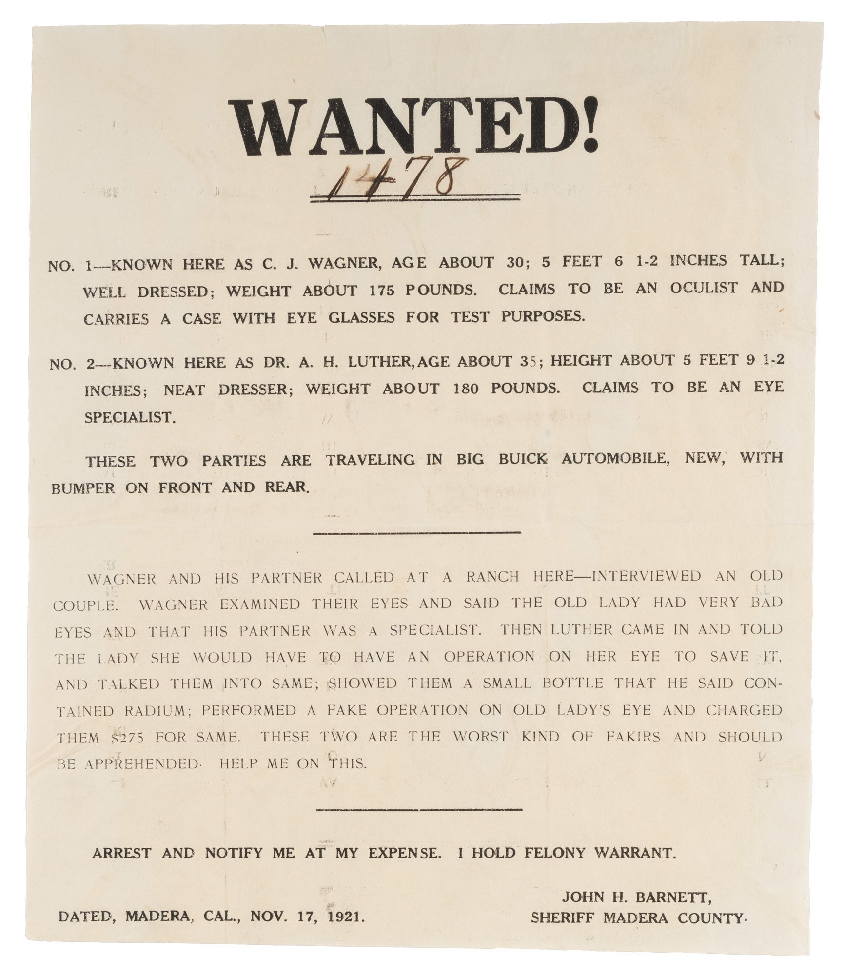 1921. Performed a Fake Operation on Old Lady's Eye and Charged Her $275" [Broadside]. [Criminals]. [California]. Wanted! No. 1 - Known Here as C.J. Wagner, Age About 30; 5 Feet 6 1-2 Inches Tall; Well Dressed; Weight About 175 Pounds. Claims to be an Oculist and Carries a Case with Eye Glasses for Test Purposes. No. 2 -Known Here as Dr. A.H. Luther, Age About 35; Height about 5 Feet 9 1-2 Inches; Neat Dresser; Weight About 180 Pounds. Claims to be an Eye Specialist. These Two Parties are Traveling in a Big Buick Automobile, New, With Bumper on Front and Back. Madera, CA, November 17, 1921. 8-3/4" x 7-1/2" (21.2 x 19 cm) broadside, single-column text below headline. Light toning and soiling, horizontal and vertical fold lines, "1478" in ink below headline. $350. * Signed in type by John H. Barnett, Sheriff of Madera County, CA. C.J. Wagner and Dr. A.H. Luther were traveling around the county and offering eye exams at ranches in the area. They "performed a fake operation on old lady's eye" and charged her $275. "These two are the worst kind of fakirs [sic] and should be apprehended.