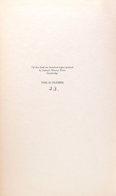 Cambridge, Massachusetts: Privately Printed. For Sale at the Dunster House Bookshop, 1927. First edition, #23 of 100 copies. Printed by Samuel Marcus Press. 30, [2]pp. 8vo. Batik boards, paper label. First edition, #23 of 100 copies. Printed by Samuel Marcus Press. 30, [2]pp. 8vo.
