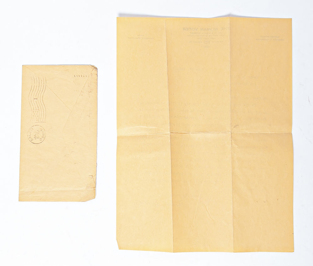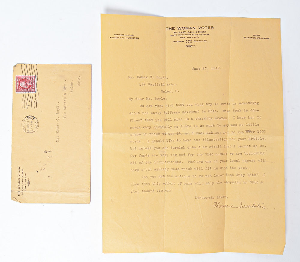 New York, New York; Salem, Ohio, 1912. Typed Letter Signed by Florence Woolston, editor of The Woman Voter on letterhead; single page dated June 27, 1912, measuring 8.5 x 11 inches with writing to recto and with by the transmittal envelope. Accompanied by a one page Autograph Letter unsigned but composed by the recipient Homer Boyle in response to Woolston's TLS; dated June 29, 1912 on blank stationery measuring 5.25 x 8.5 inches with writing to recto. Together, these letters give insight into the relationship between national suffrage publications and local grassroots organizations as the women's movement entered the final push toward the 19th Amendment.
