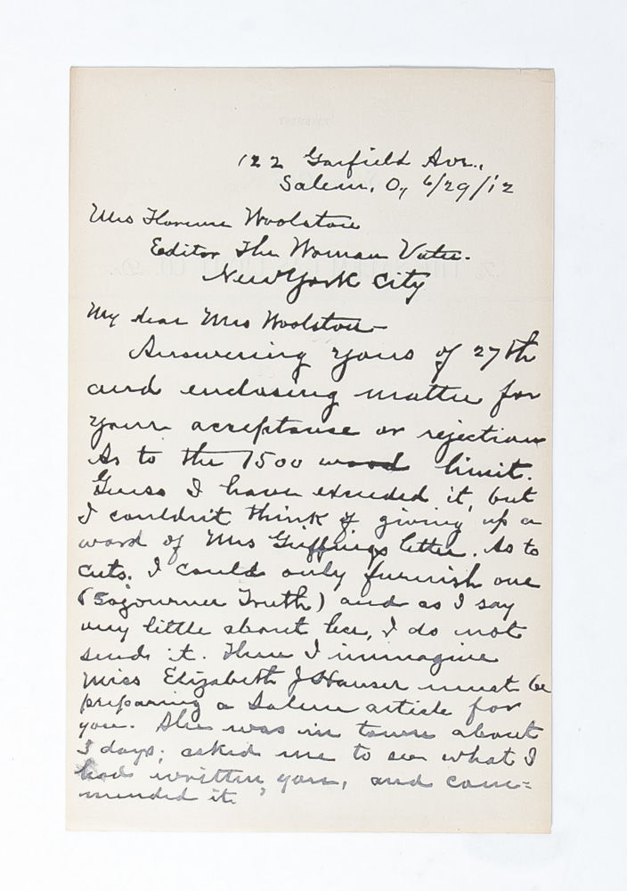 Homer Boyle, the proprietor of a plumbing shop according to the U.S. Census of 1910, also occasionally published progressive pieces in Salem's local newspaper. Within two days of receiving Woolston's letter, he displays his serious commitment by "enclosing matter for your acceptance or rejection." Yet he also reveals a struggle to meet Woolston's professional requirements. "As to the 1500 word limit, guess I have exceeded it, but I couldn't think of giving up a word...As to cuts, I could furnish one (Sojourner Truth) and as I say very little about her, I do not send it." Seeming to recognize his possible missteps, he closes by appealing to another more local female authority. "I imagine Miss Elizabeth Hauser must be preparing a Salem article for you. She was in town about 3 days; asked me what I had written you, and commended it."