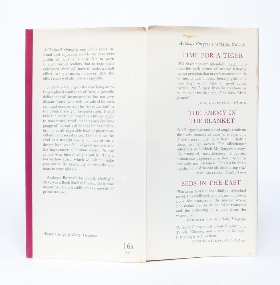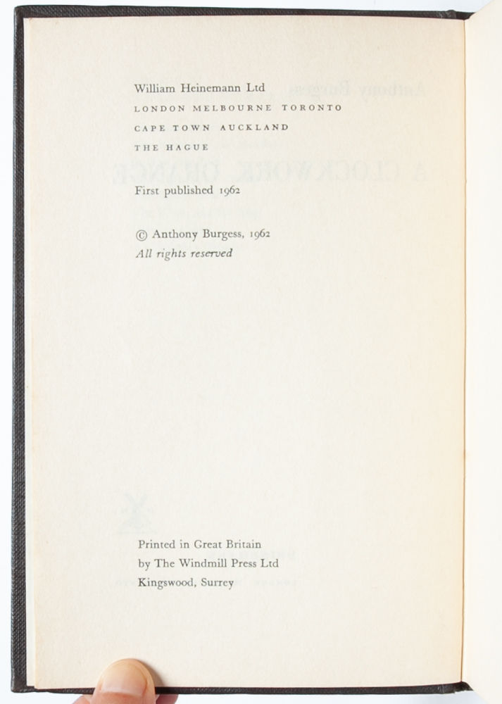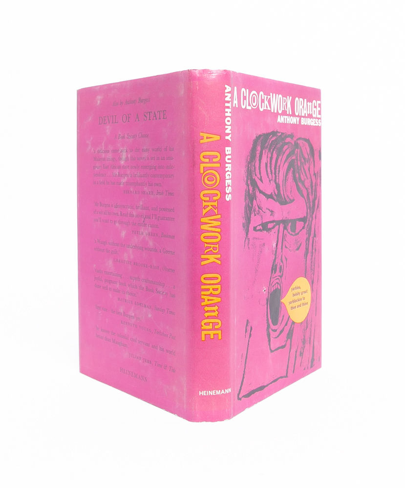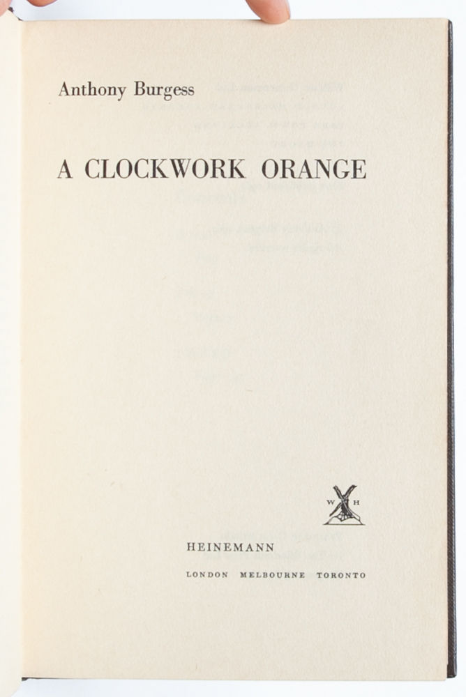 A story that raises questions about crime, punishment, and human nature. Setting out in a London of the future, Alex seeks thrills and entertainment by committing "a little of the old ultraviolence" on other citizens of the city. Following a particularly violent episode, Alex is jailed and submits to a new form of physical and psychological punishment that will affect his own humanity for the rest of his life. "A Clockwork Orange is Anthony Burgess' most famous novel, and its impact on literary, musical, and visual culture has been extensive. The novel is concerned with the conflict between the individual and the state, the punishment of young criminals, and the possibility of redemption" (Burgess Foundation). Near Fine in Near Fine dust jacket.