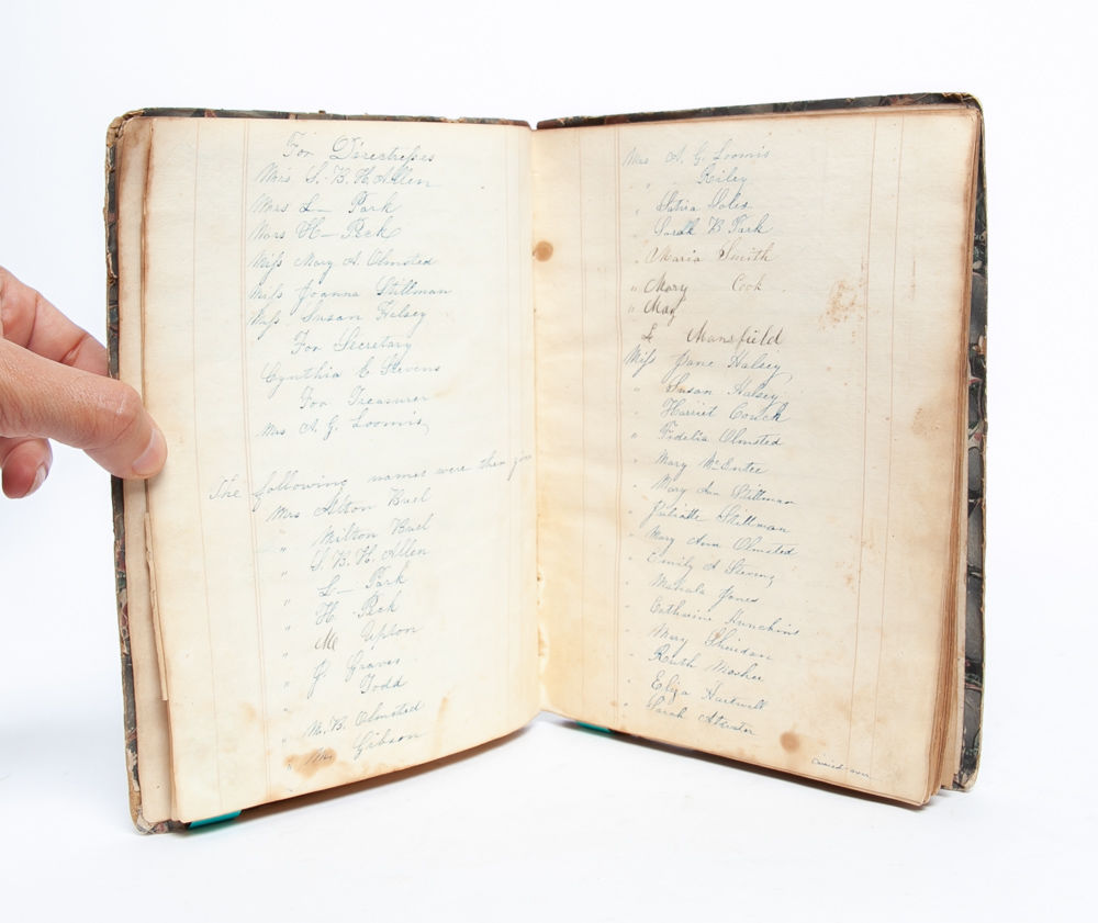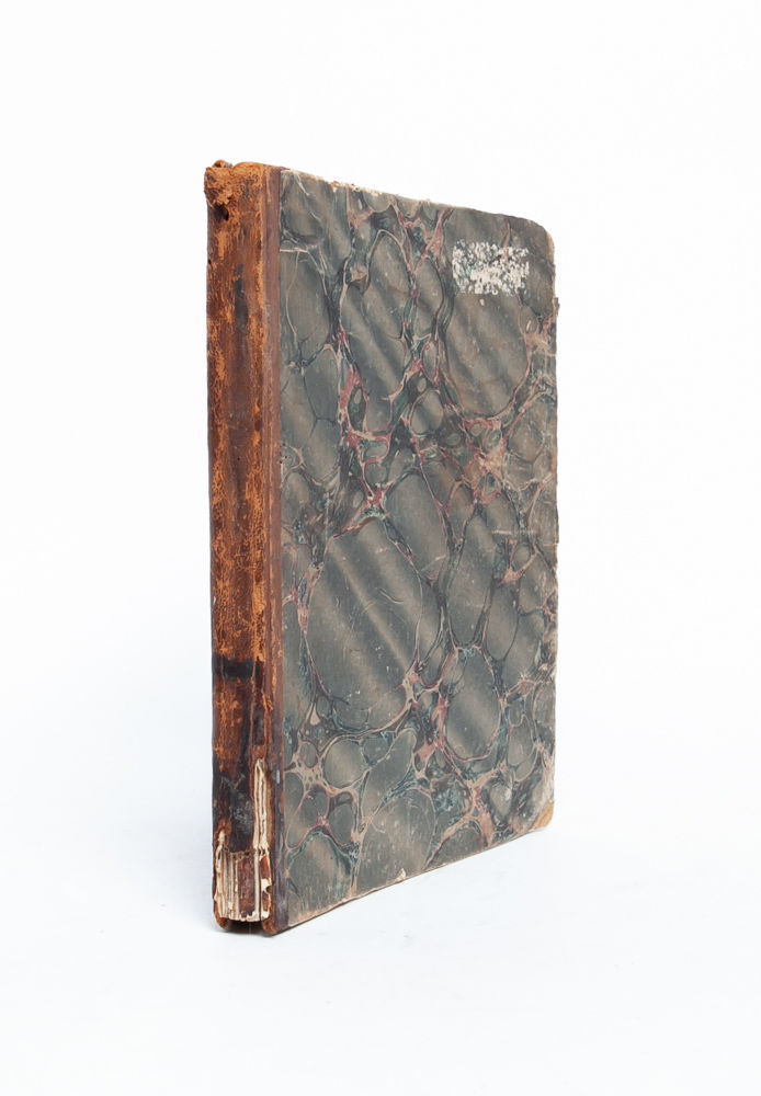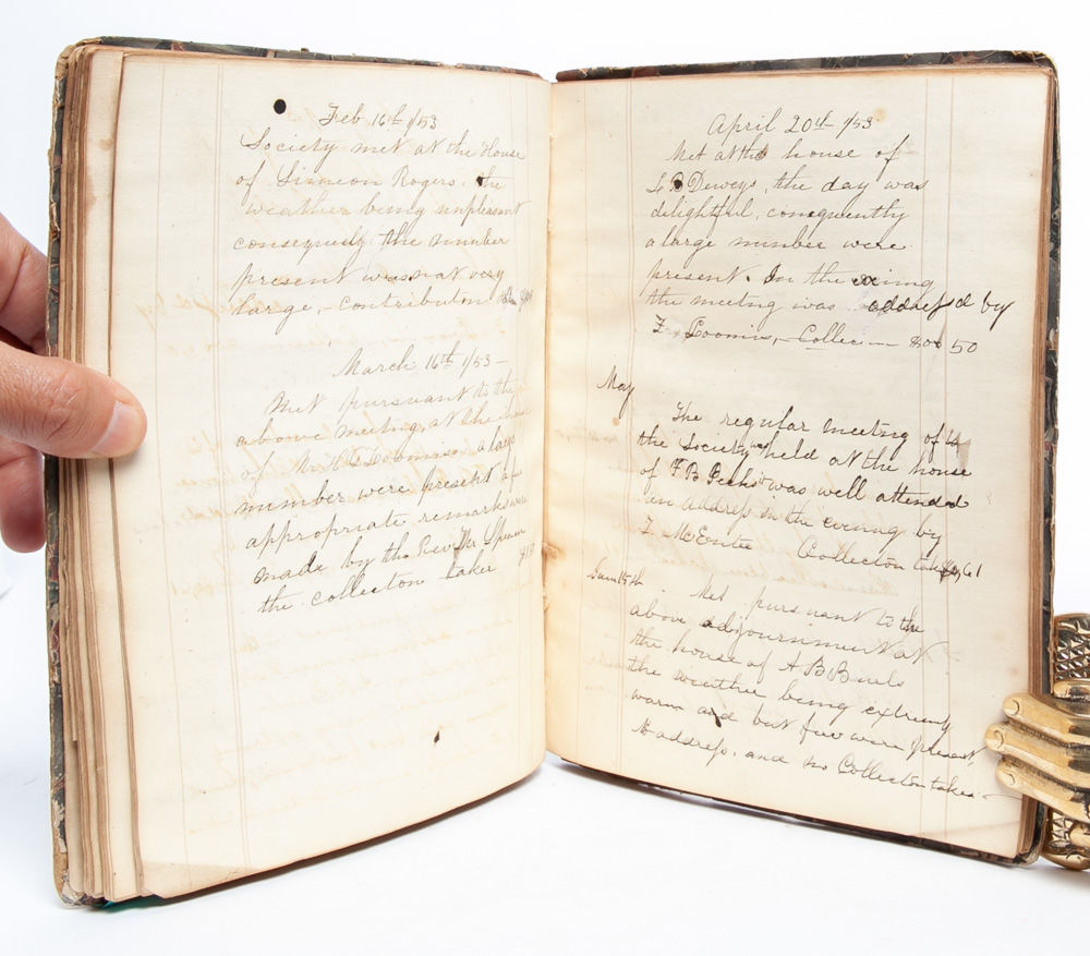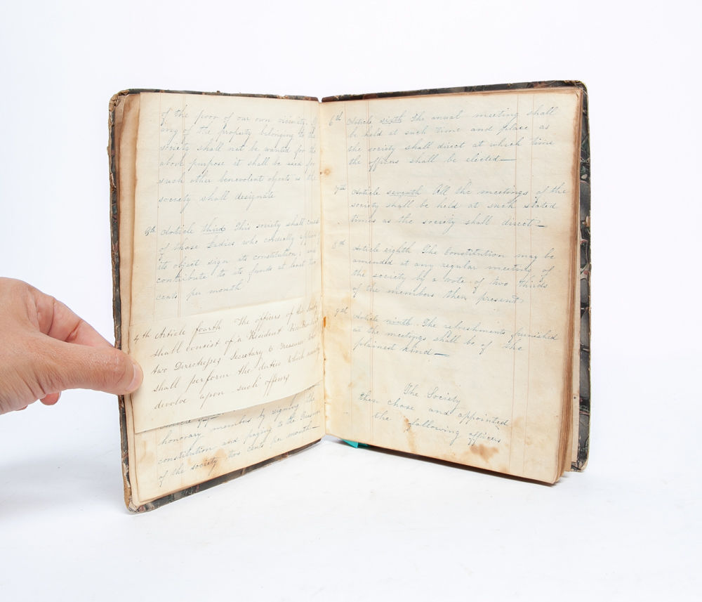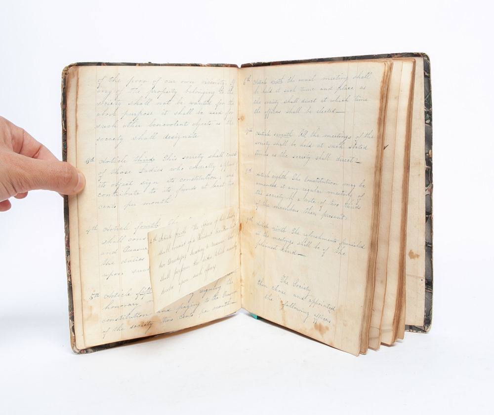 Walesville [NY], 1854. Contemporary quarter roan over marbled boards. Spine and boards worn, with loss to foot of spine and evidence of label removal to front board. Internally foxed and soiled, but remaining legible throughout. Comprised of 53 handwritten pages in various hands. Documenting the founding of the women's group focused on local philanthropy, which allowed men entry only as silent, "honorary" members, the manuscript outlines the group's goals and structure in addition to recording officers, participants, and meetings during its first eight years.