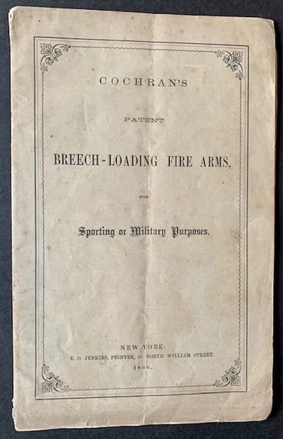 New York: Mr. J. Webster Cochran, 1866. Original wraps. Very Good. Scarce 1866 catalogue featuring Mr. J. Webster Cochran's patented breech-loading fire arms. Presentable and VG in its stapled, light-gray wrappers, with mild foxing and creasing to the panels, amd very light dog-earring along the rear tips. One of the signatures still holding by the string but somewhat loose. Includes several full-page engravings. Octavo, printed by E.O. Jenkins of North William Street in New York.