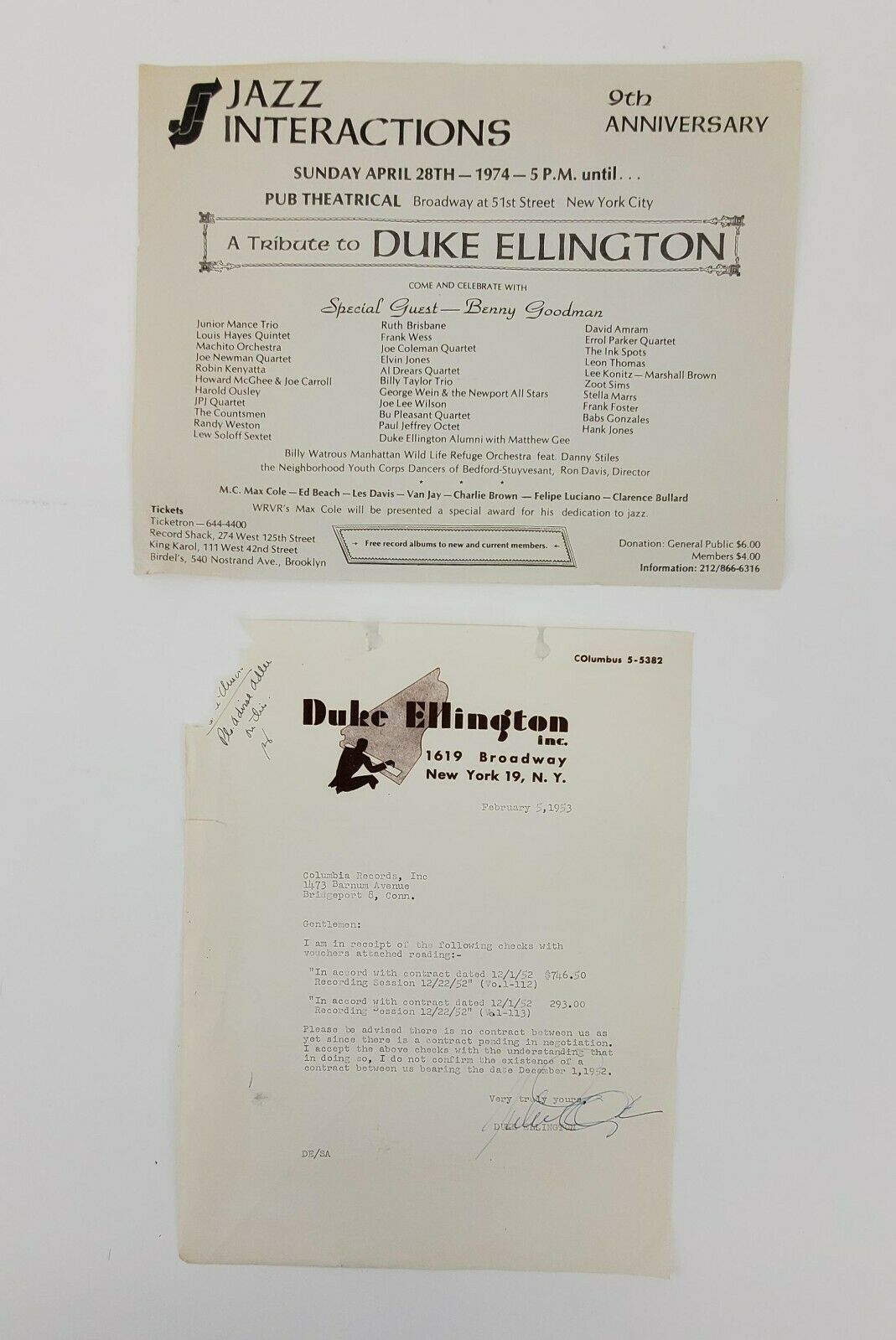 1943/1953/1974. A four-item collection of classic Ellington documents: a typed letter signed by Ellington and three music programs. Item #1: The letter is from Ellington to Columbia Records regarding two payments received despite the non-completion of contractual negotiations. Dated February 5, 1953, and typed on 8 ½ " x 11" personal stationery. Ellington's signature appears in blue ink on the signature line. Very good; light staining and wrinkles with open tears to left corner and upper edge of the letter. Item #2: A program and flyer for Jazz Interactions' April 28, 1974 tribute to Duke Ellington. Ellington would die less than one month later. The flyer is one page on 8.5" x 11" copy paper, landscape orientation. Mentions special guest Benny Goodman. In very good condition. Mild wear with some wrinkles to left corner. The program is saddle stitched and measures 5.5" x 7.5". New York, 1974. Pamphlet, 31 pages. In very good condition. Some wrinkles along spine. Item #3. Program for a Duke Ellington tribute concert on April 29, 1976 (a benefit performance for Cuttington College in Liberia commemorating Ellington on what would have been his 77th birthday). In very good condition. A bifold program on one sheet of card stock, measuring 5.5" x 7.5". Vertical crease down the middle, and light age-toning throughout. Item #4: A musical program for an Ellington performance at Carnegie Hall in New York. The performance took place December 11, 1943. The four-page show notes are also included, which lists the appearance of several other performers including Fats Waller and Billy Strayhorn. The program contains a number of ads and announcements for other upcoming shows. Program: New York, 1943. Slim Octavo, 15 pages. In very good- condition. Covers have moderate soiling, two small ink marks and pencil notation on the front cover, and mild age-toning. The interior has mild age-toning as well; Notes: New York, 1943. Leaflet (5.5" x 8.5"), 4 pages. In very good condition. Light age-toning.