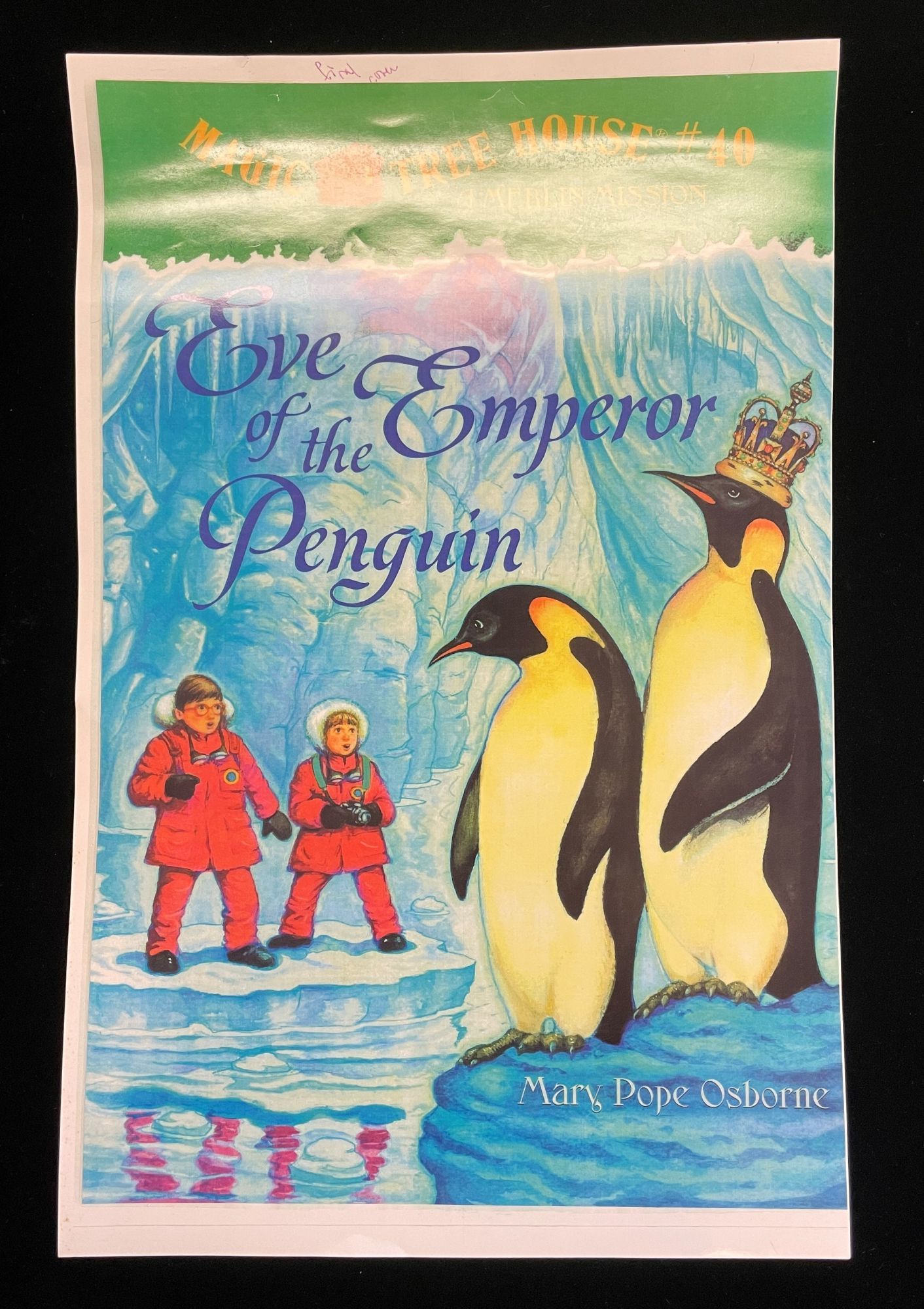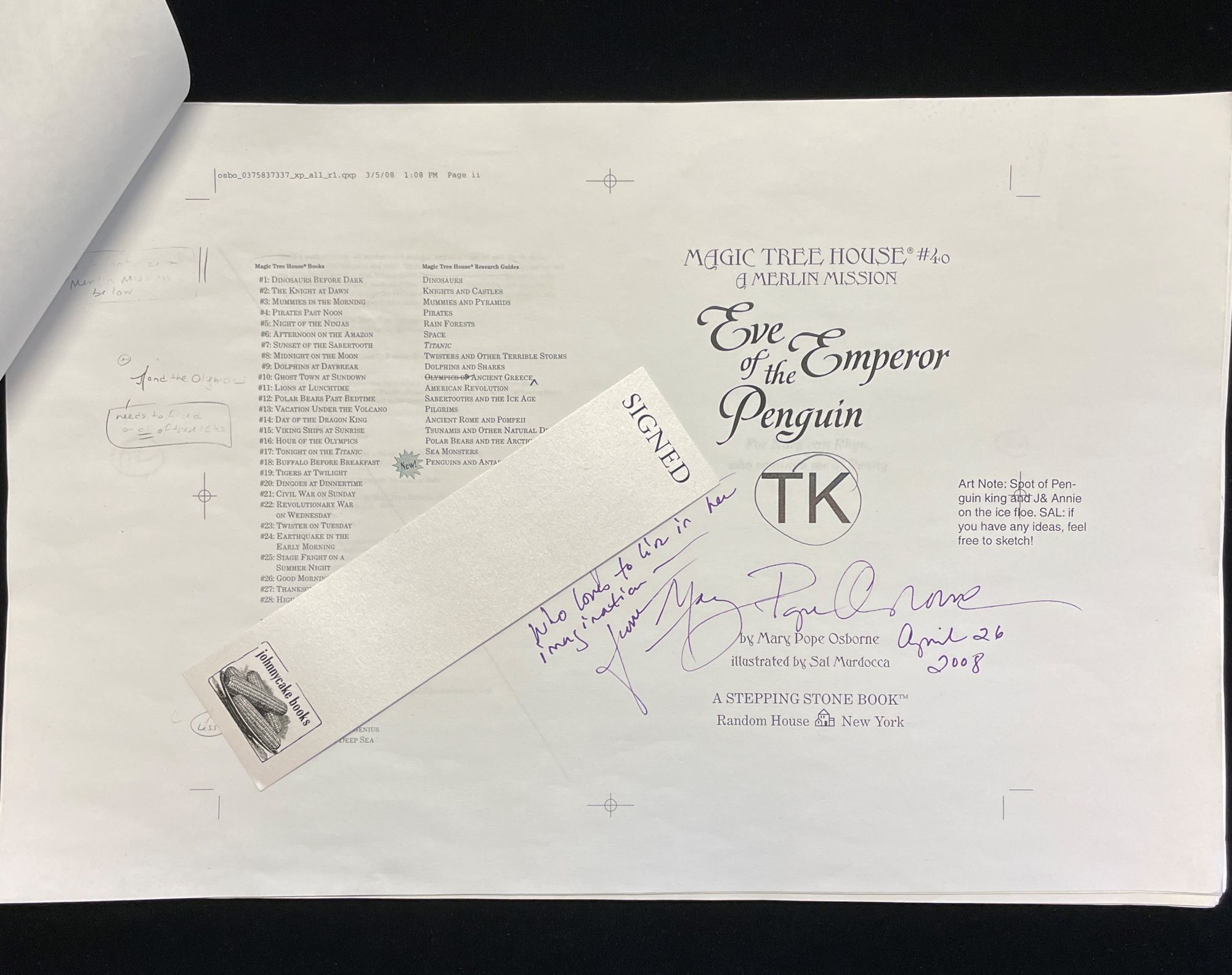 NY: Stepping Stone/ Random House, 2008. 1st Edition. Soft cover. Very Good. Galley pages for #40 in Osborne's Merlin Mission series, with her line edits in pencil and inscribed in ink by her on the title page. Also included is a prototype for the cover (tan ice?) that was discarded in favor of blue ice (DAH!). Inscription reads: "For xxxxx who loves to live in her imagination, from Mary Page Osborn April 26 2008" . Besides plenty of line edits, Osborne has penned on the cover sheet "to be published fall '08". On the discarded cover art, she notes "(first cover - color changed to blues for final cover'). Unique.