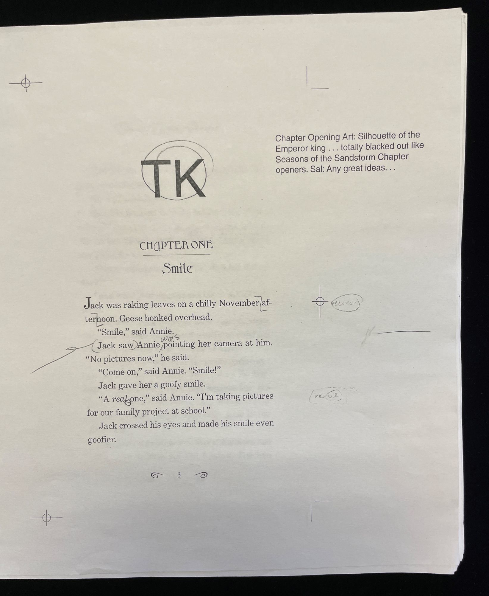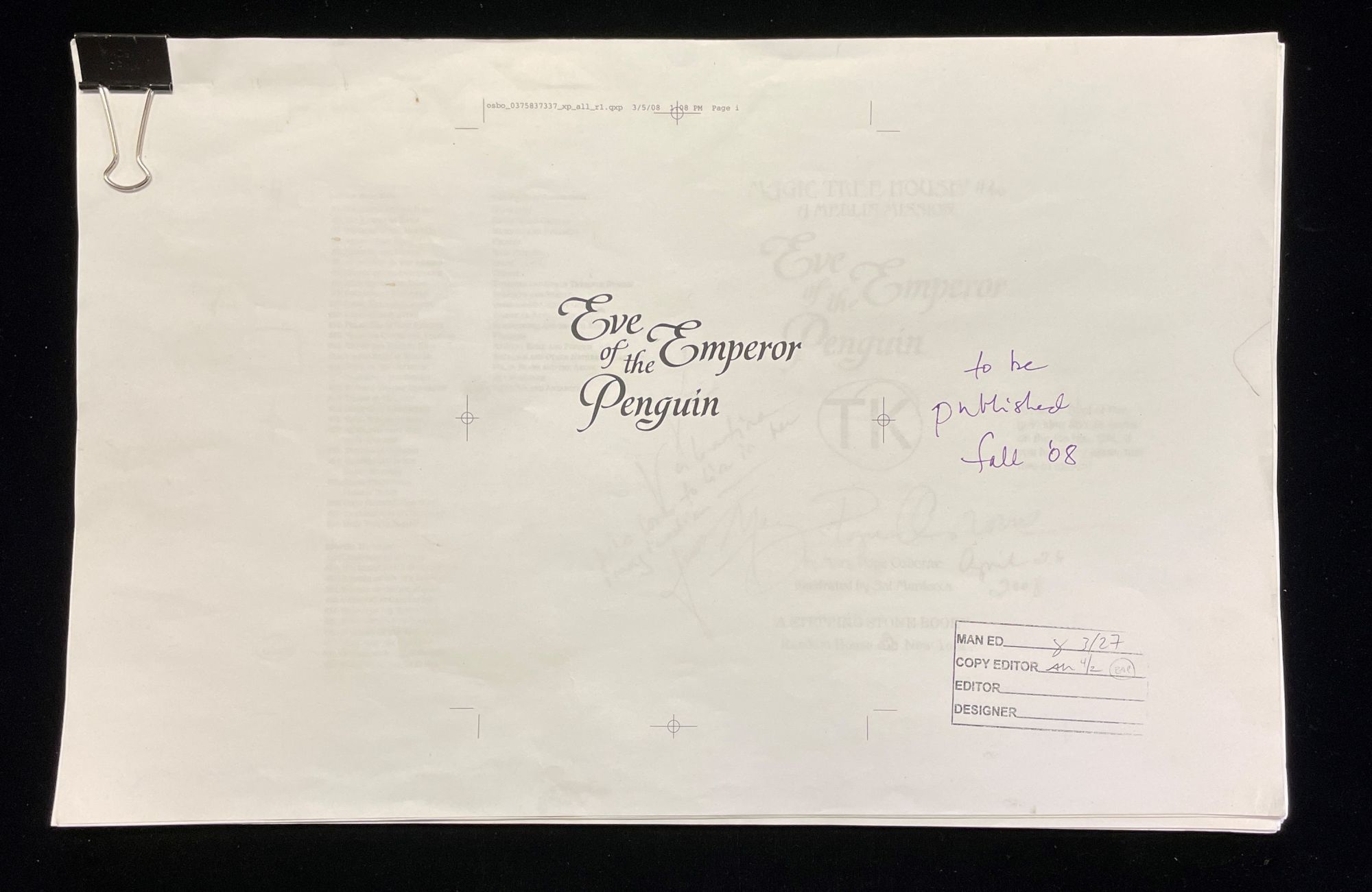 EVE EMPEROR OF THE PENGUIN (annotated galley sheets, with first discarded cover art)