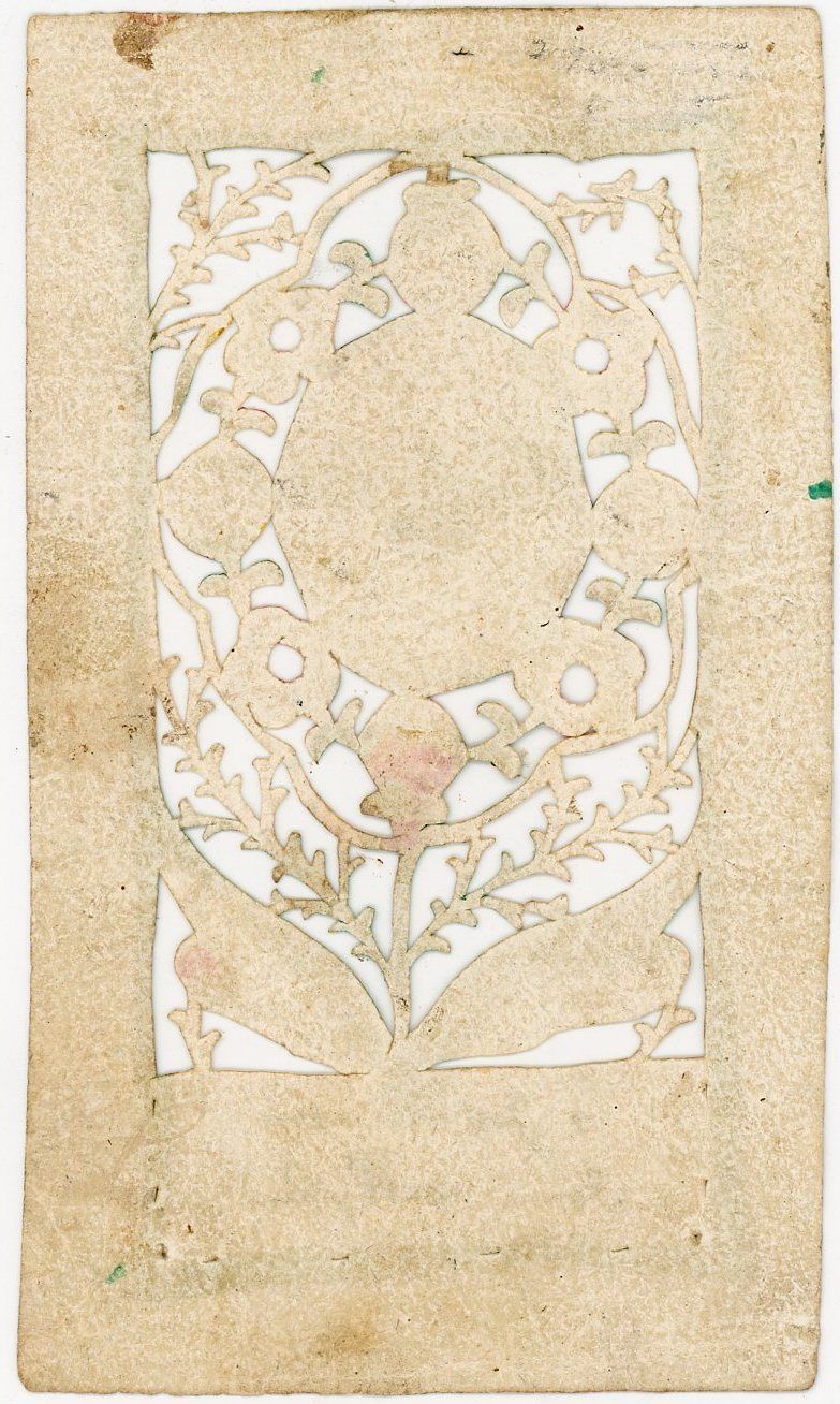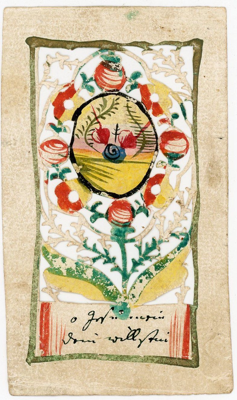 A 4 1/2" x 2 1/2" delicate hand made paper devotional or "Nun Cut" Flaming hearts surrounded by roses and thorns Verse reads " O God ... will Again. Vivid watercolor decoration with gold and green border decoration. Reverse is blank.