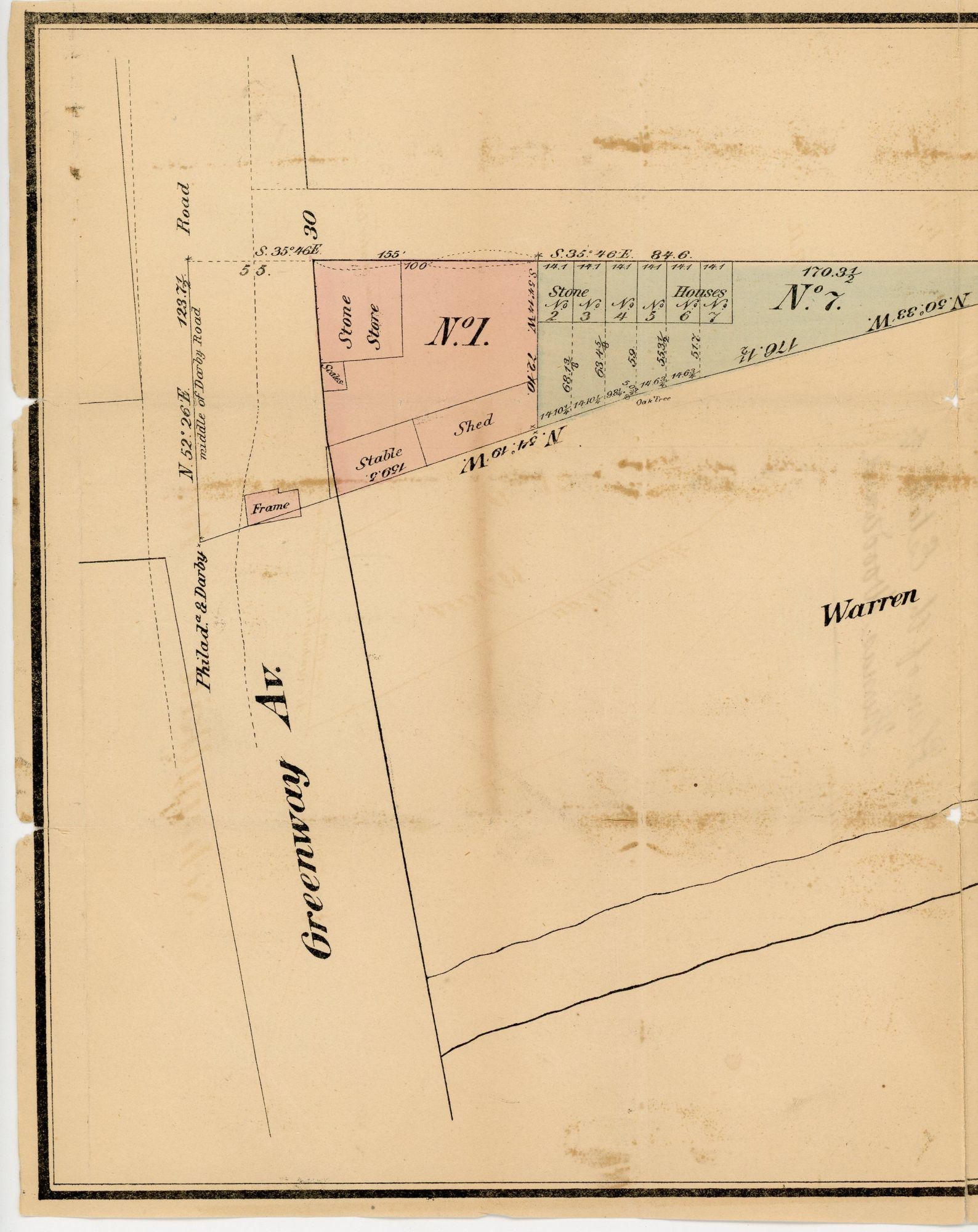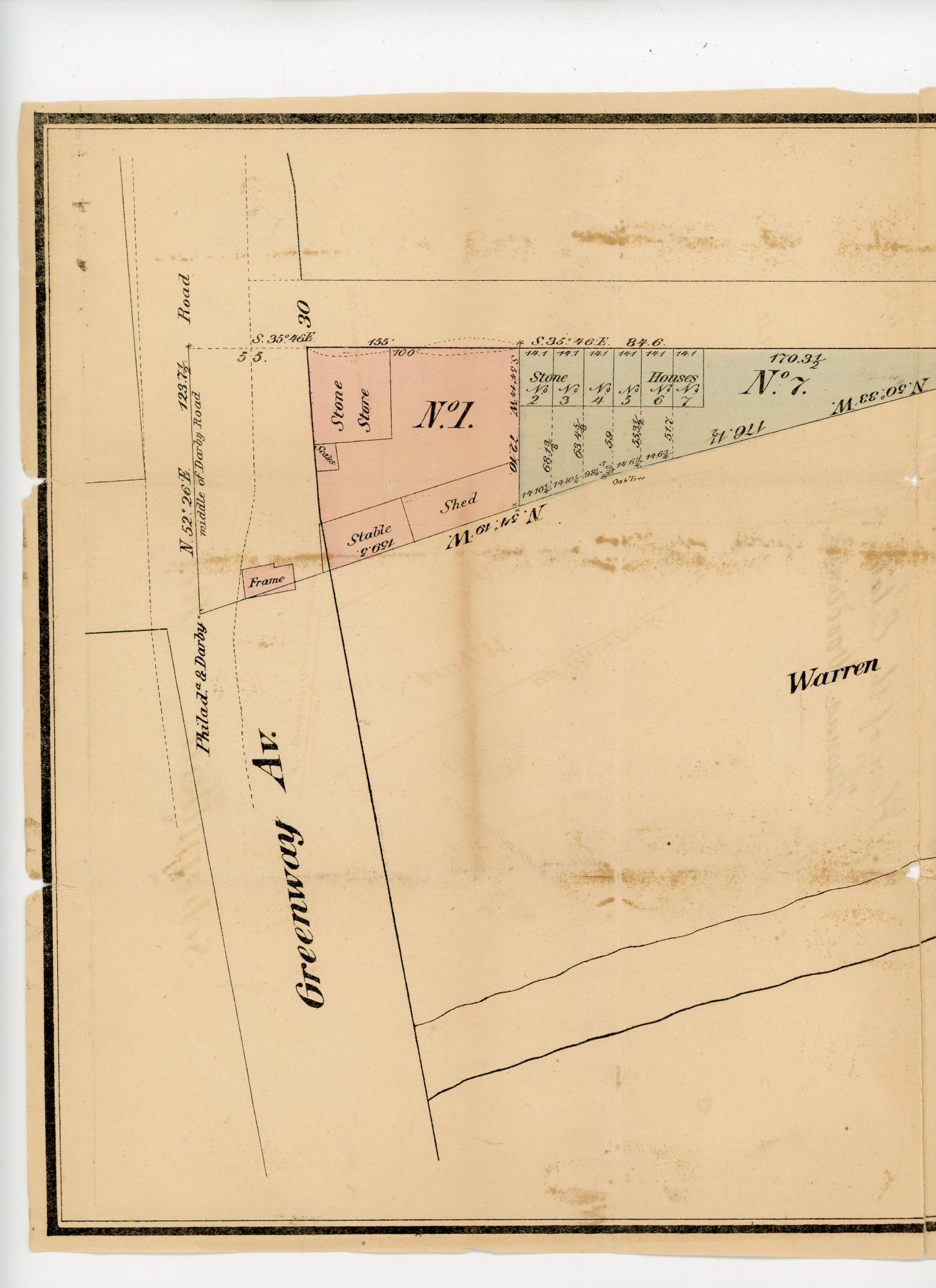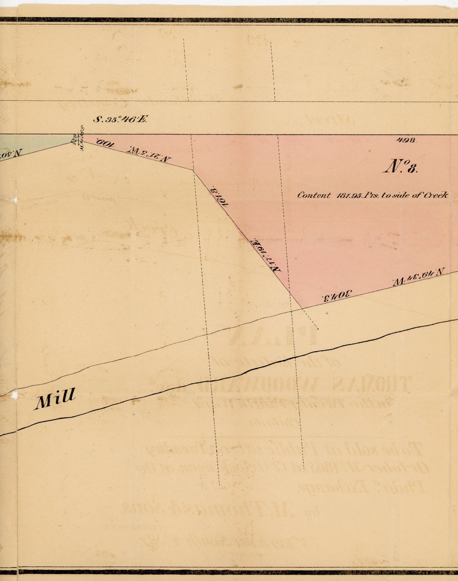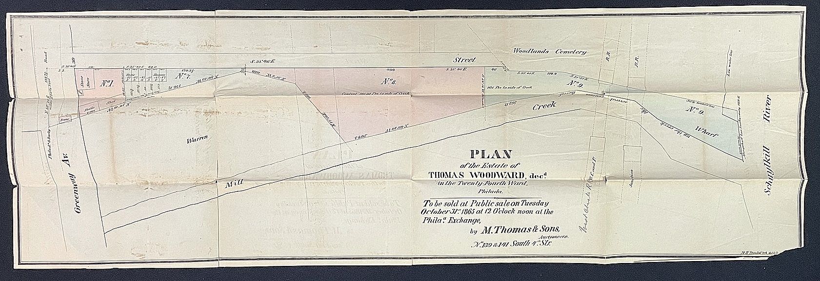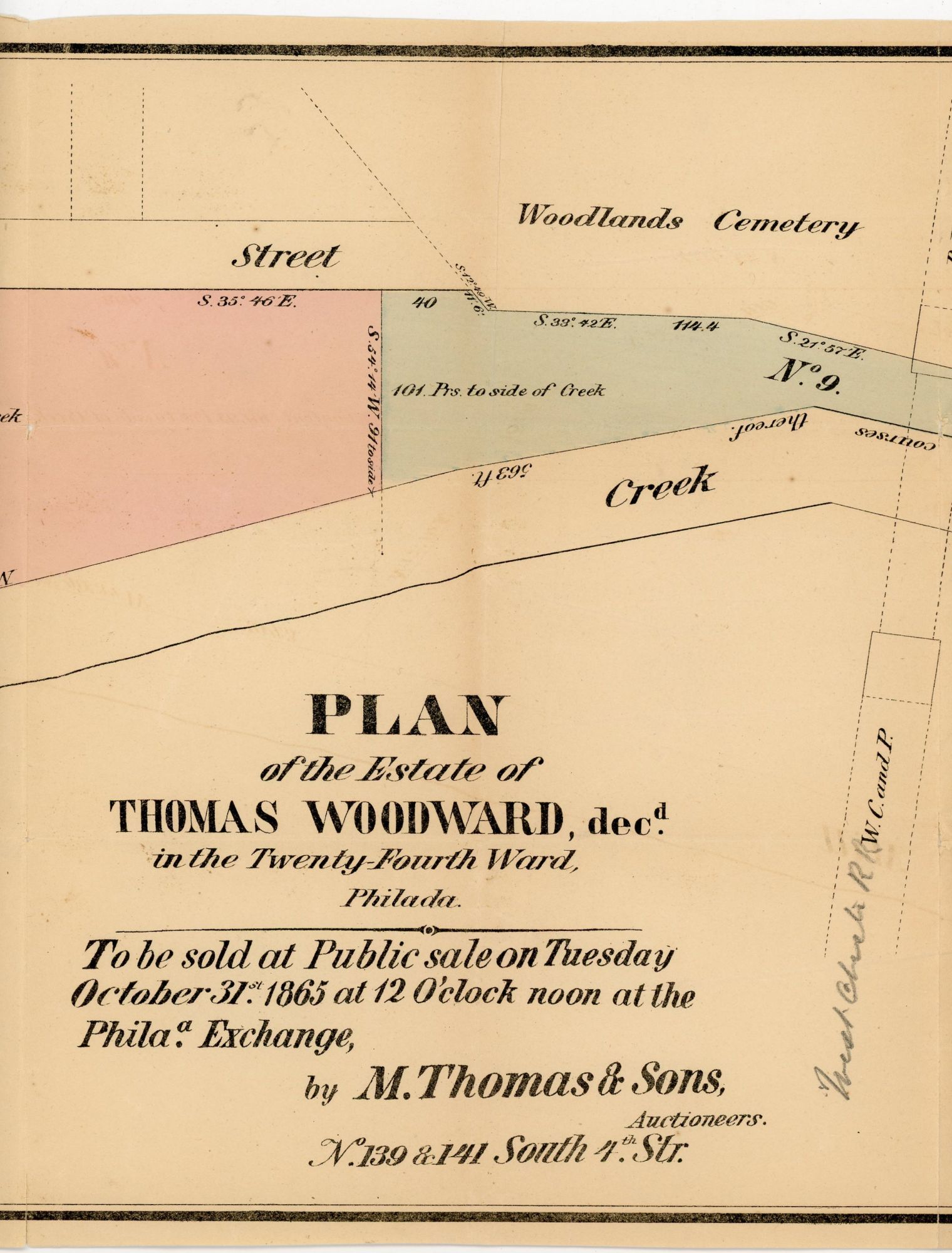 Philadelphia, PA, 1865. Light wear. 1 1/2" x 1/4" paper lose lower right margin; Light separations at folds.. A 10 1/2" x 32" Plan of the Estate of Thomas Woodward, deceased, in the Twenty-fourth Ward, Philadelphia. To be sold at 12 O'clock noon at the Phila. Exchange, by M. Thomas & Son, Auctioneers. Plat by M. H. Traubel. Well annotated and marked. Watercolor highlights. Woodward resided at No. 14 Woodland Terrace and died suddenly at the age of 44. He was survived by his wife and seven children. Buried in Wilmington, DE.