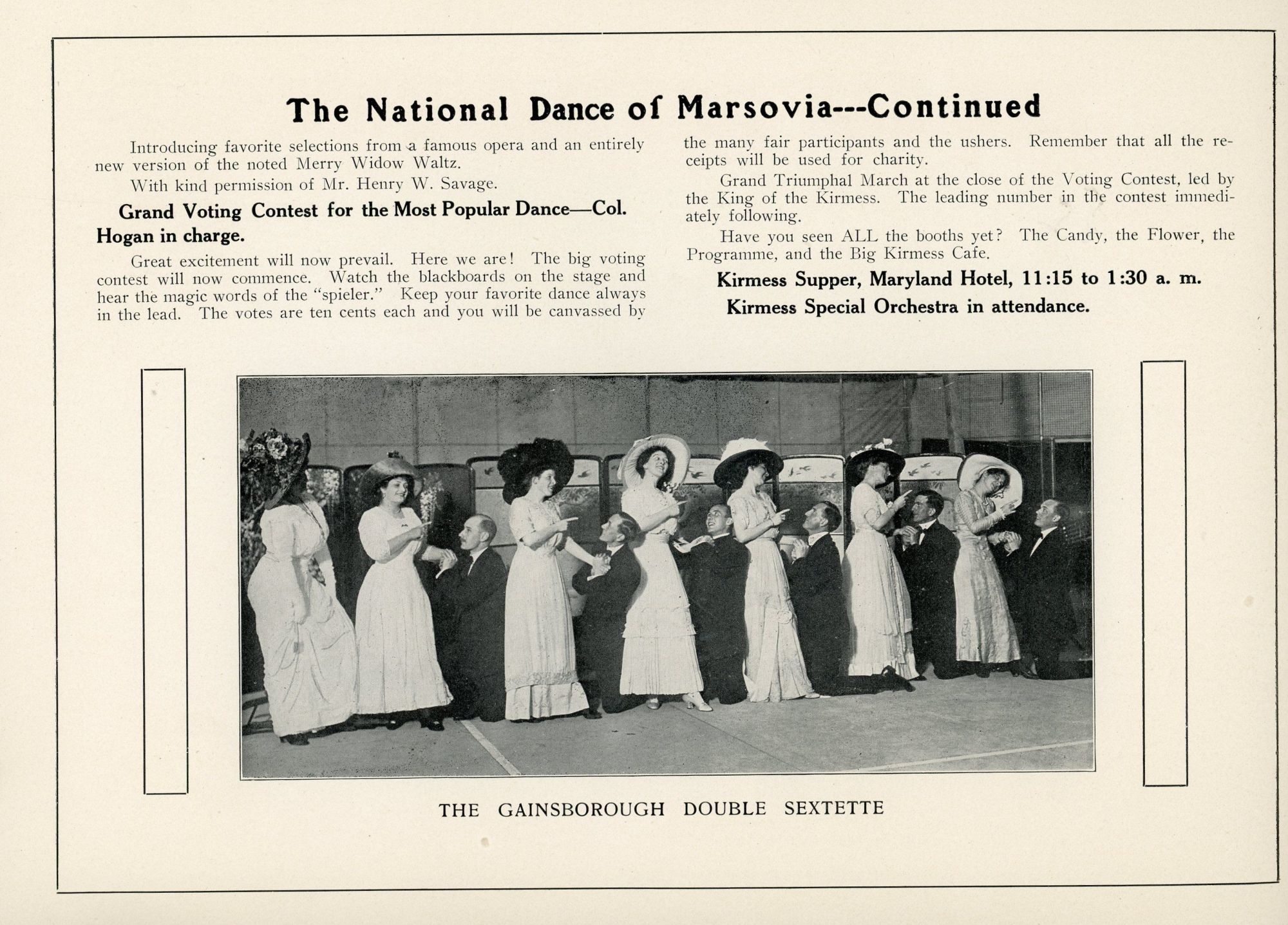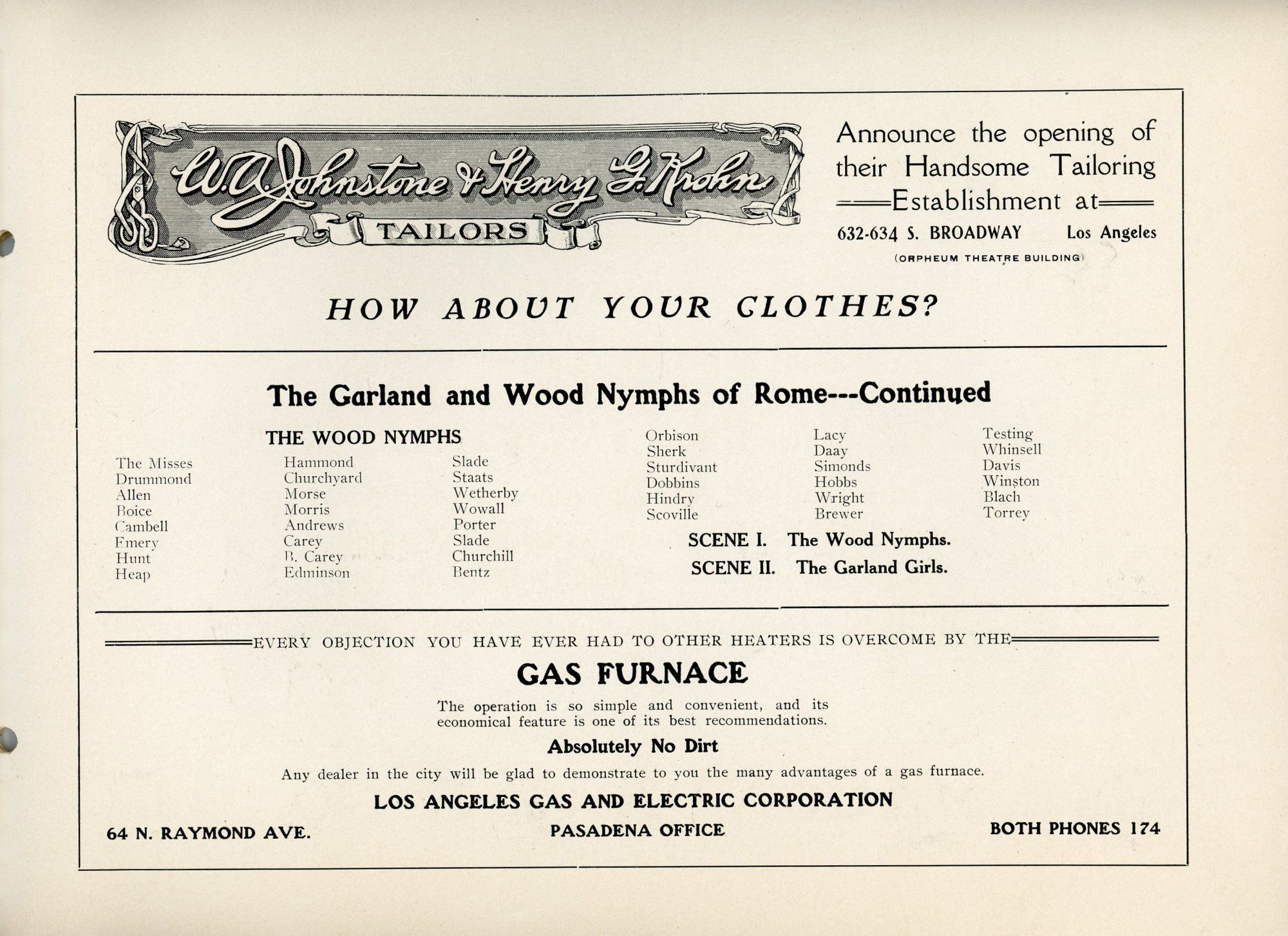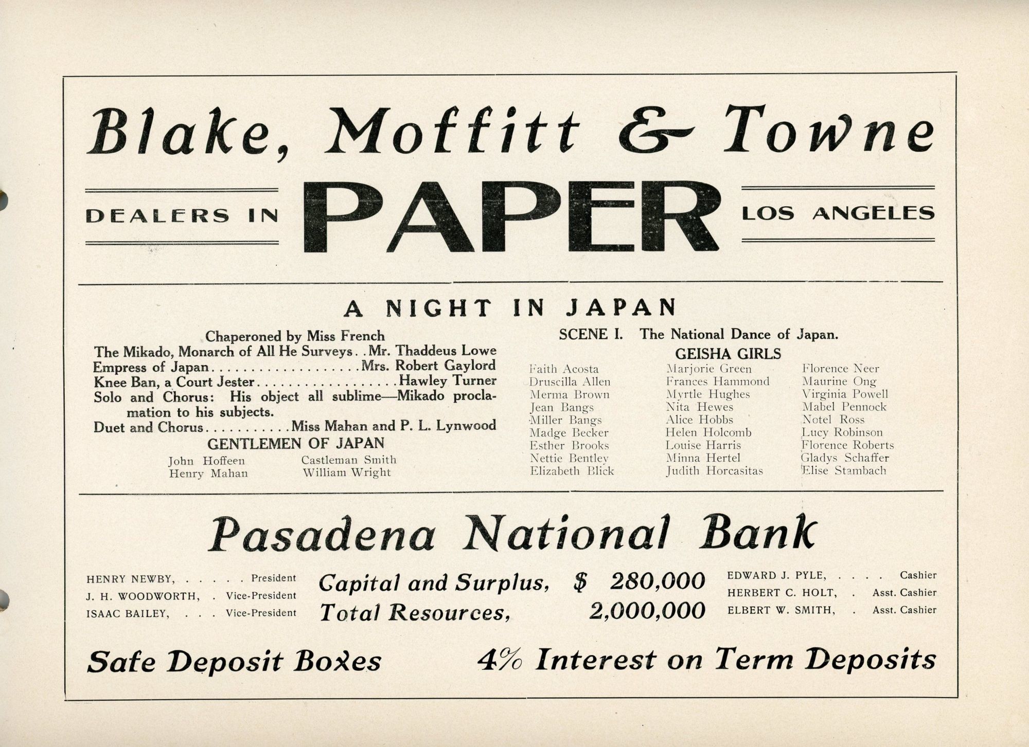Pasadena, CA - Hotel Maryland, 1911. Light wear.. 32 pp. (unnumbered). Illustrated wraps. A two-evening performance with an extensive list of acts and performances to benefit the Pasadena Children's Training Society. As presented by F. M. Agostini and P. L. Lynwood. Heralding women on front cover heralding the festivities. The Program Synopsis includes 20 different activities including Night in Japan, Italian Romance, The Garland and Wood Nymphs of Ancient Rome, The Spanish Dancers, The Bohemians or Gypsies, La Carmencita, The National Dances of Marsovia, Grand Voting, Grand Closing March, Kirmess Supper and much more. It also includes the names of all patrons and performers. All of the content of the program is sandwiched in advertisements for area business and hotels such as Pacific Coast Motor Car Co., Hotel Green, San Gabriel Valley Bank, The Raymond, Blake, Moffitt & Towne Paper and many many more. Quite informative of the region's commerce of the day. Measures 9" x 12