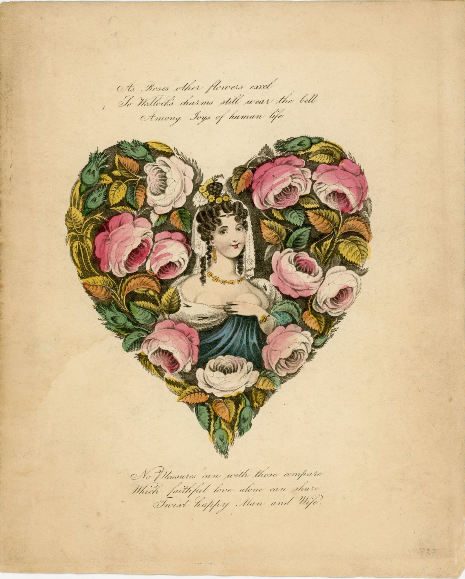 1829. Light edge toning and discoloration.. A single-fold 10" x 8" valentine with a handcolored lithograph image in the shape of a heart. A stately somewhat voluptuous woman amidst large rose blossoms. The verse begins " As roses other flowers excel...Twist happy Man and Wife". Inside pages blank. A crown watermark with "J & M 1927 below.