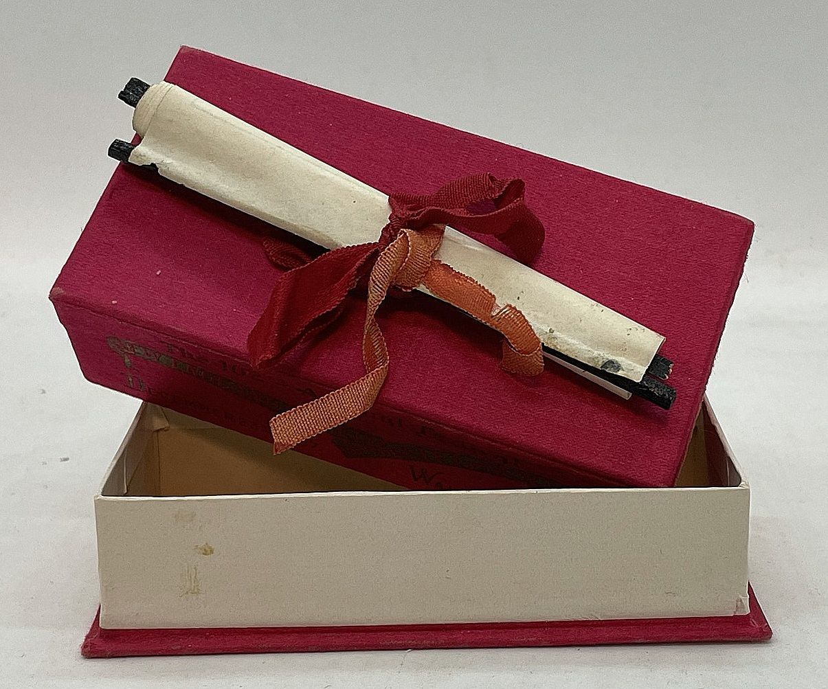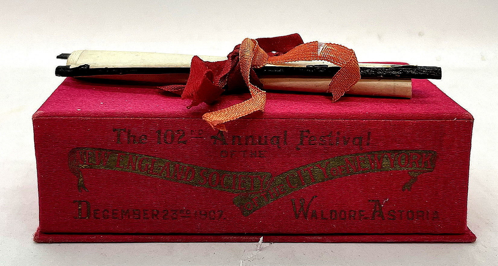 New York New York - Waldorf Astoria, 23-Dec-07. Light ribbon wear; else fine.. A 2" x 4 1/2" x 1 1/4" silk covered press board box with The 102nd Annual Festival of the New England Society of the City of New York, December 23, 1907, Waldorf Astoria in woven silk on box side. Affixed to the top with a ribbon tie is a scrolled piece of paper. When opened the scroll reveals a somewhat detailed map of New England. No contents in the box. The New England Society in the City of New York (NES) is one of the oldest social and charitable organizations in the United States, and was founded in 1805 to promote "friendship, charity and mutual assistance" among and on behalf of New Englanders living in New York.
