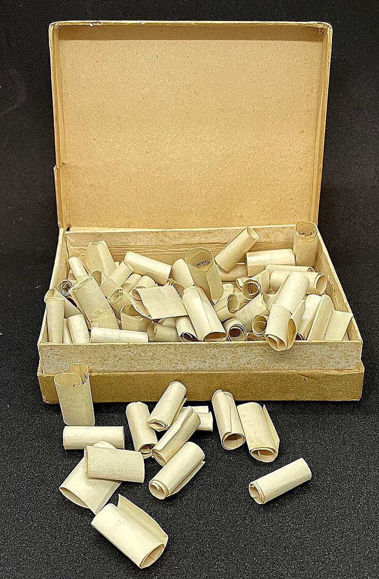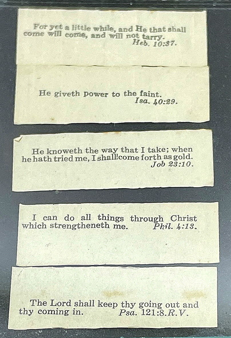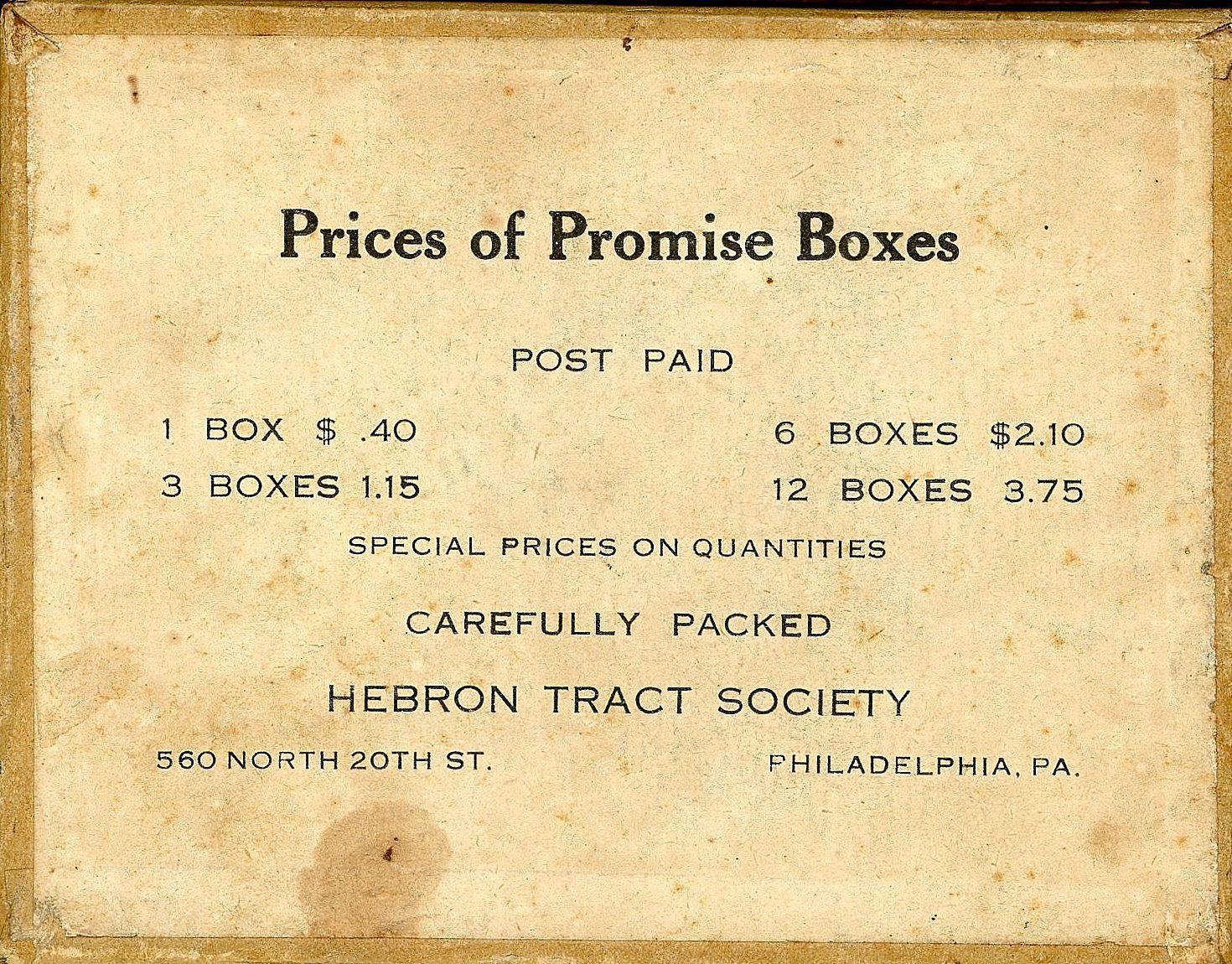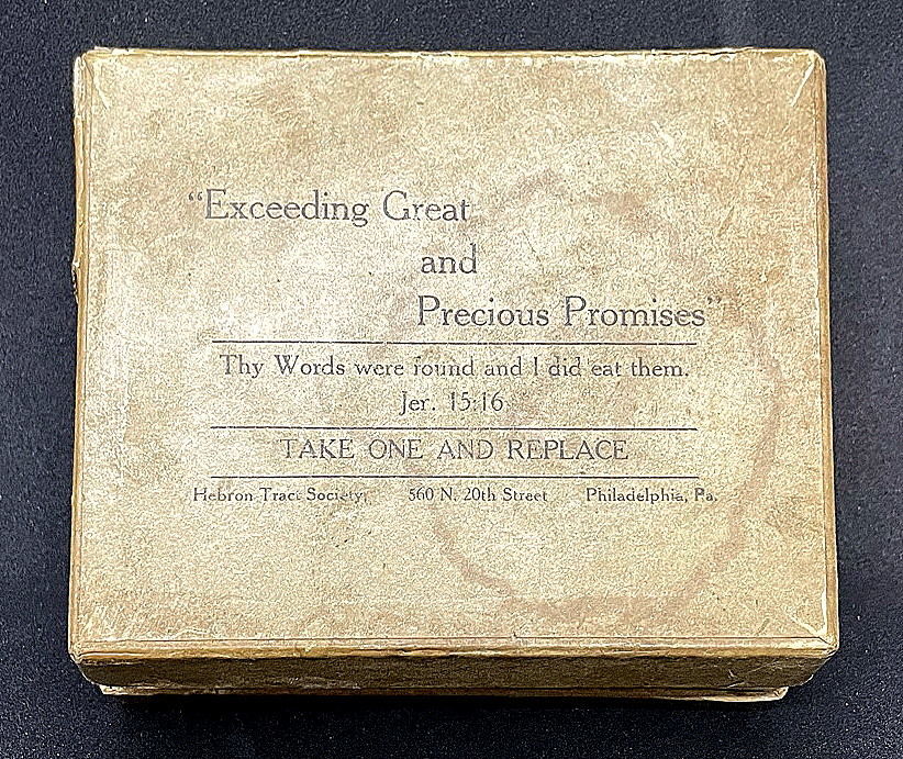 Philadelphia, PA: Hebron Tract Society, 1916. Stain and discoloration on box top with some paper lose and separation on apron.. A 4" x 5" x 1 1/8" lidded paper covered box with printed label on top. It reads "Exceeding Great and Precious Promises" Thy Words were found and I did eat them Jer. 15:16. TAKE ONE AND REPLACE. When opened it reveals rolled paper inspirational Bible verses. An applied label on the bottom of the box provides information on purchasing additional Promise Boxes. An interesting concept whether Bible proverbs, fortune cookie fortunes, or inspirational messages.