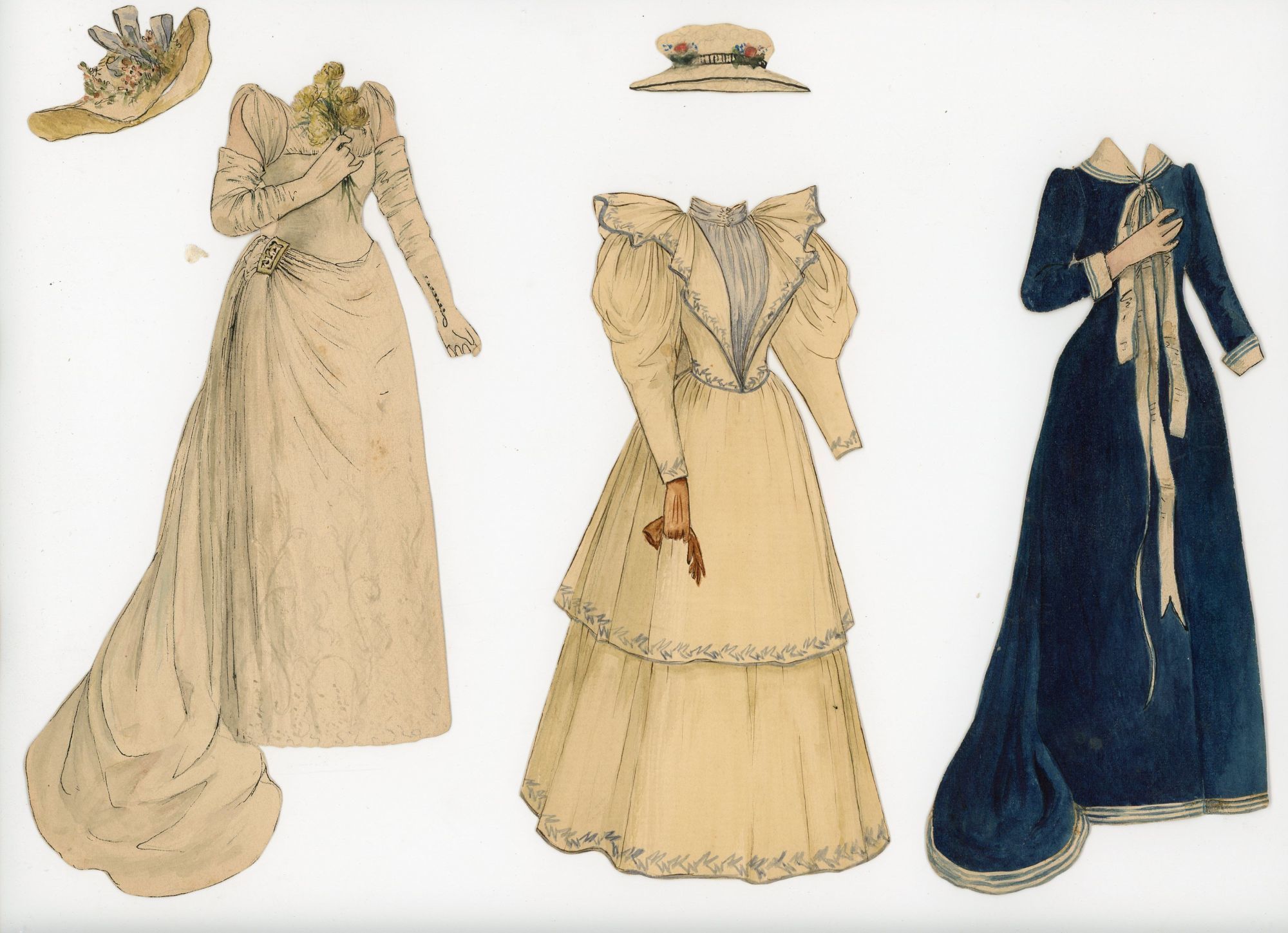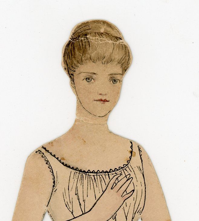 1880. Neck reinforcement. One hand lacking. Shoe reinforced.. A 7 " well executed handmade papers depicting a fine Victorian lady along with her three costumes, 3 hats and night jacket. A formal white gown, appearing as a wedding gown, and two additional day dresses. Loop tabs on reverse of costume slide over the paper doll to keep the clothing in place.