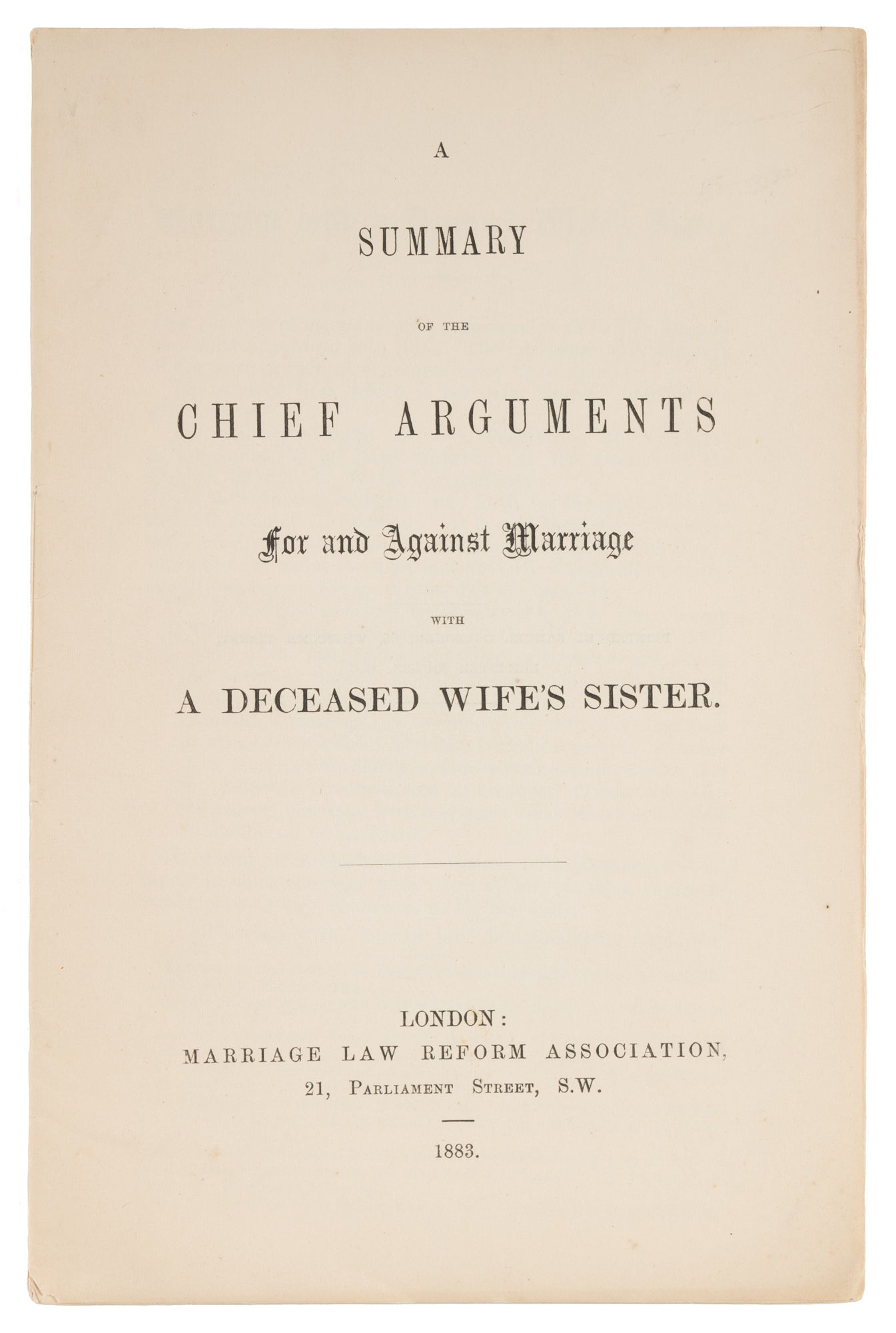 1883. Marriage to a Deceased Wife's Sister Marriage Law Reform Association. A Summary of the Chief Arguments For and Against Marriage With A Deceased Wife's Sister. London: Marriage Law Reform Association, 1883. 15, [1] pp. Octavo (8-1/4" x 5-1/2"). Stab-stitched pamphlet in self wrappers. Light toning, negligible edgewear, light foxing in a few places. $350. * Third and final edition. The Marriage Law Reform Association was incorporated in 1851 as opposition to Lord Lyndhurst's Marriage Act of 1835 grew. The Act prohibited the marriage of a widower to his deceased wife's sister, reflecting Victorian anxieties around incest, family purity and the role of the church. Despite the Association's long campaign, the Act was not repealed until the Deceased Wife's Sister's Marriage Act in 1907.