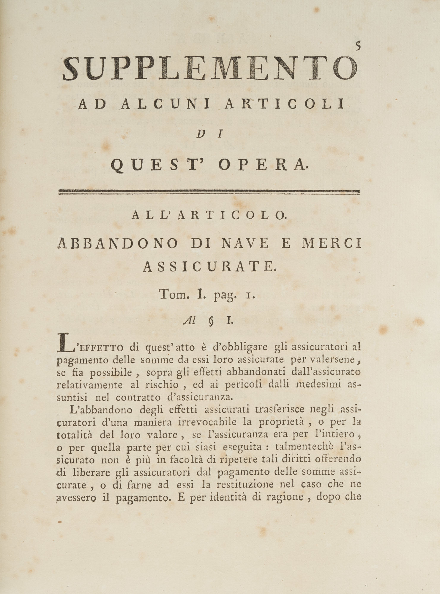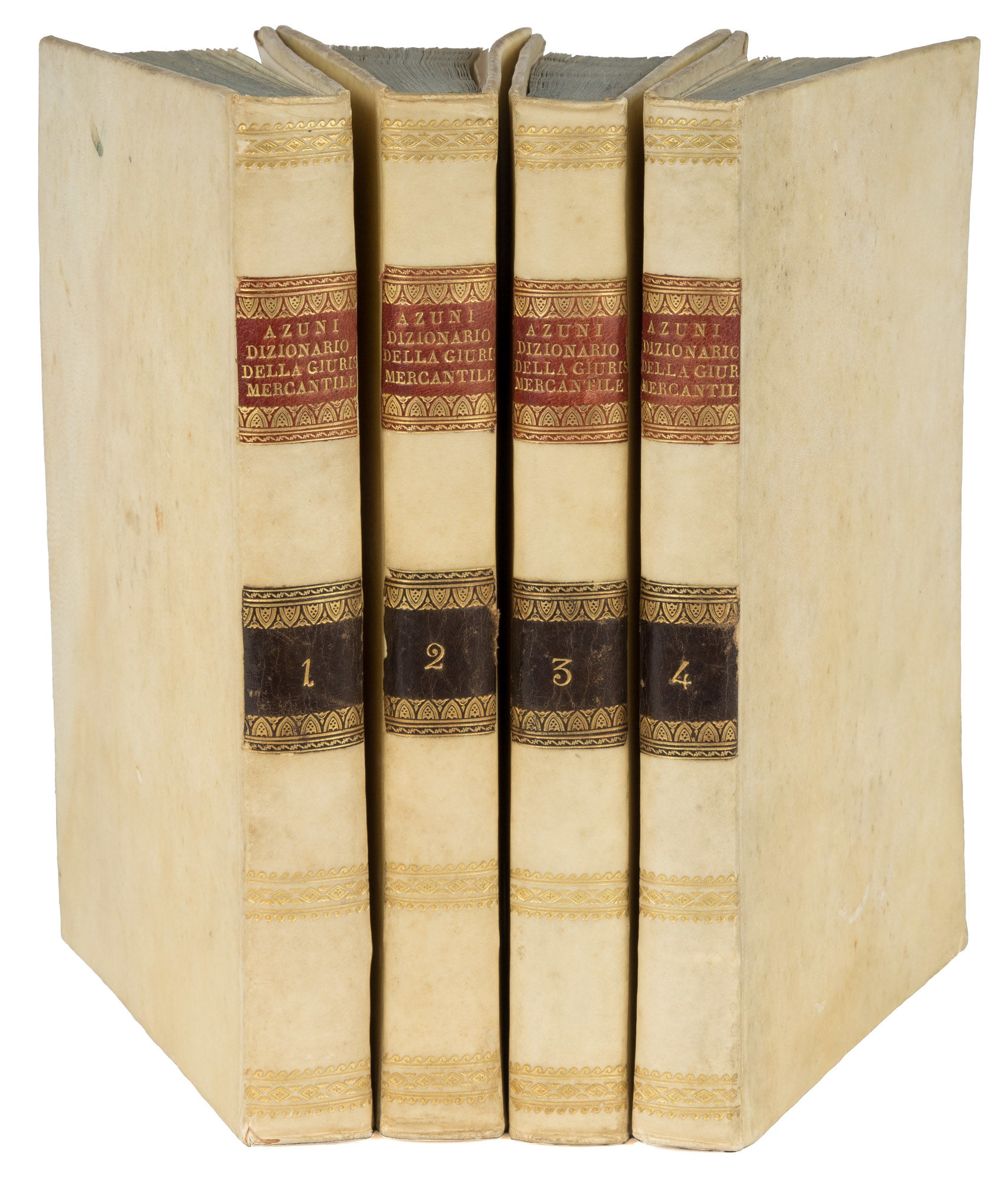1788. Nizza, 1786-1788. First edition. 4 vols.. Nizza, 1786-1788. First edition. 4 vols. A Rare First Edition of Azuni's Commercial Law Dictionary in Handsome Bindings Azuni, D[omenico] A[lberto] [1749-1827]. Dizionario Universale Ragionato Della Giurisprudenza Mercantile. Nizza: Presso la Societa Tipografica, 1786-1788. Four volumes. [v], xx, 392, [2]; [viii], 378, [2]; [viii], 398, [2] pp., [2]; [viii], 296 pp., 55 pp., [3]. Volume 4 contains a 55 page Supplement. Quarto (9-1/2" x 7-1/4"; 24 x 18.5 cm) Contemporary vellum, gilt fillets and red and black calf lettering pieces to spines, speckled edges. Boards lightly bowed, spine ends lightly bumped, light wear to edges of lettering pieces. Light toning to interiors, light foxing in places. A very good copy of a title rare in commerce. $1,750. * First edition. An authority on mercantile law, Azuni was an Italian jurist and a writer who later became a French citizen, president of the appeal court at Genoa and judge of the commercial court at Cagliari. He is best-known for his Maritime Law of Europe (1806), which was a standard authority in the United States. Adapted in part from Baldasseroni's Dizionario (1807), it is more an encyclopedia or essay collection than a dictionary. Both synthetic and critical, it refers often to the leading treatises of commercial law. Marvin found it useful because it "contains the results of many authors, not readily accessible." Useful for its definitions, it is equally interesting because it has detailed criticism of the literature by a contemporary expert. The final edition, the fifth, was issued in 1844. Marvin, Legal Bibliography 81-82 (citing the second edition). Goldsmiths' Library of Economic Literature 13182.