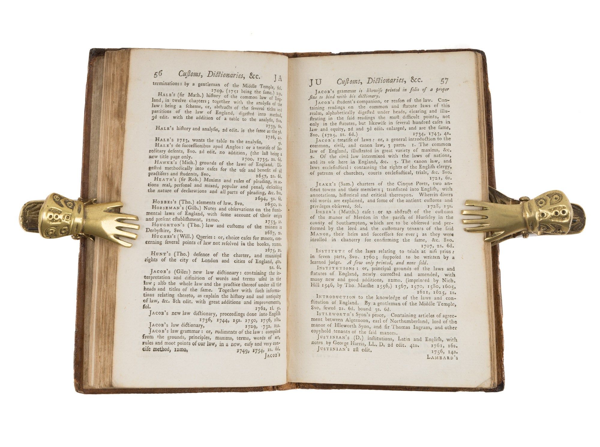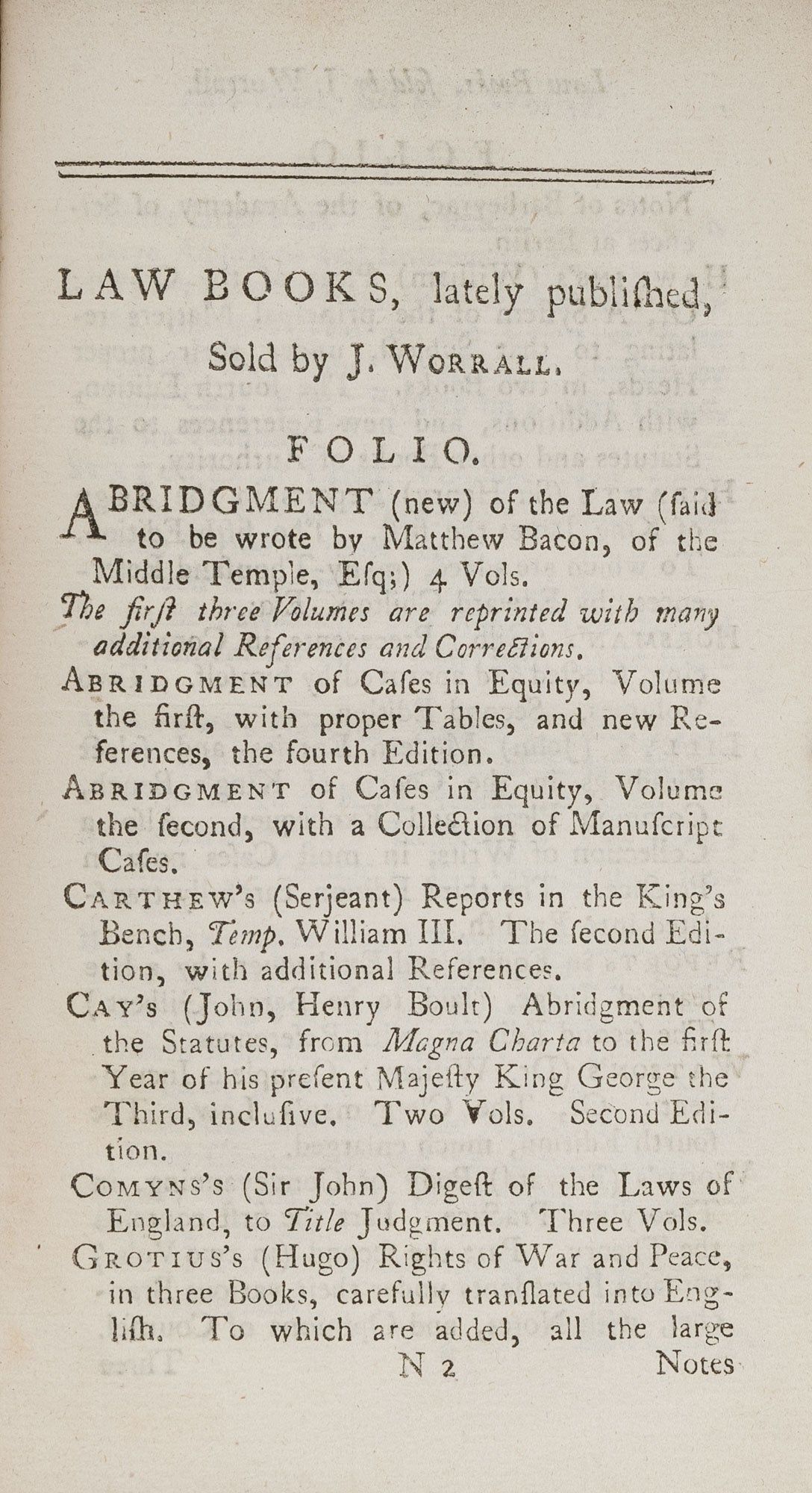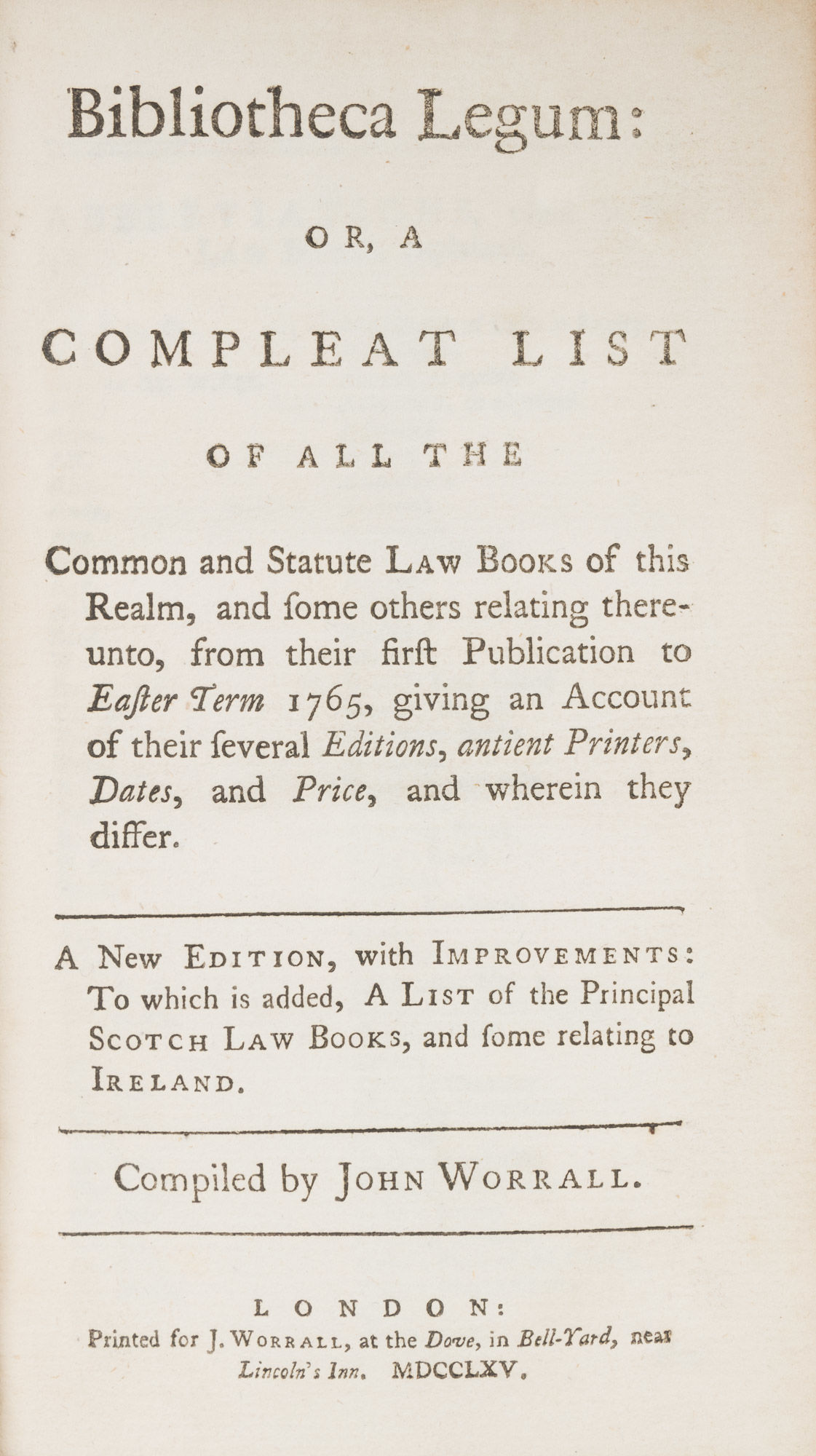 1765. The First Annotated English Legal Bibliography [C] Worrall, John [d. 1771], Compiler. Bibliotheca Legum: Or, A Compleat List of All the Common and Statute Law Books of this Realm, And Some Others Relating Thereunto, From Their First Publication to Easter Term 1765, Giving an Account of Their Several Editions, Antient Printers, Dates, And Price, And Wherein They Differ. A New Edition, With Improvements: To Which is Added, A List of the Principal Scotch Law Books, And Some Relating to Ireland. London: Printed for J. Worrall, 1765. [xii], 133, [11] pp. Publisher advertisement facing title page. 12mo. (6-1/4" x 3-3/4"). Contemporary sheep, rebacked in period style, blind rules to boards, blind fillets along joints, raised bands to spine. A few scuffs, nicks and minor stains to boards, moderate rubbing to board edges with some wear to corners, hinges partially cracked, owner signature (of Michael Blisteed Westrop dated 1765) to front pastedown, early owner annotations to rear endleaves and pastedown. Light toning to interior, light soiling to a few leaves. $450. * Later edition. The first annotated English legal bibliography, it remains an important reference due to its excellent annotations, many gathered from leading authorities of the time, and comparative bibliographical information. John Worrall, believed to be the first law bookseller, issued the first edition in 1731, and published numerous editions during his lifetime. Friend, Anglo-American Legal Bibliographies 138. English Short-Title Catalogue N43429.
