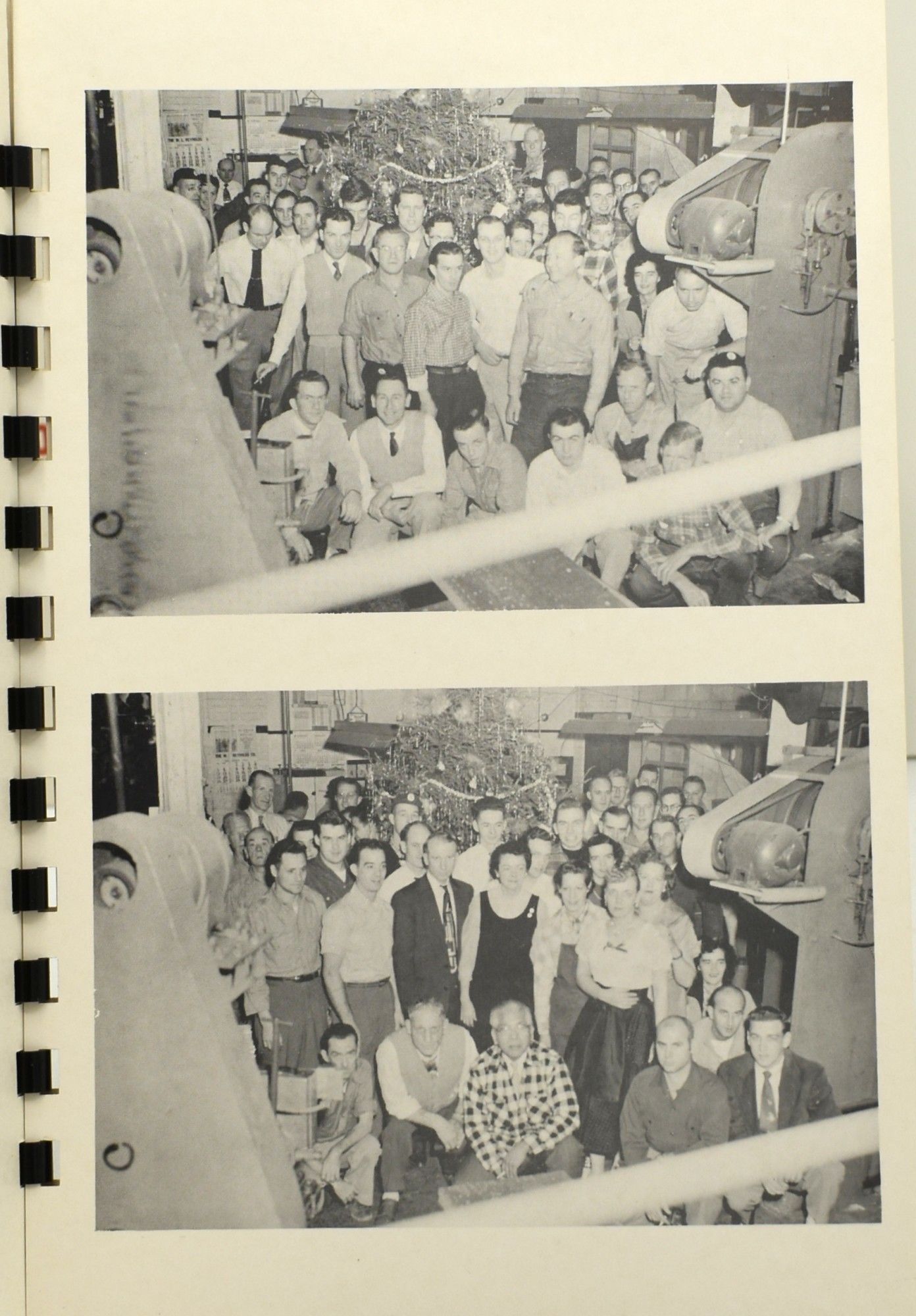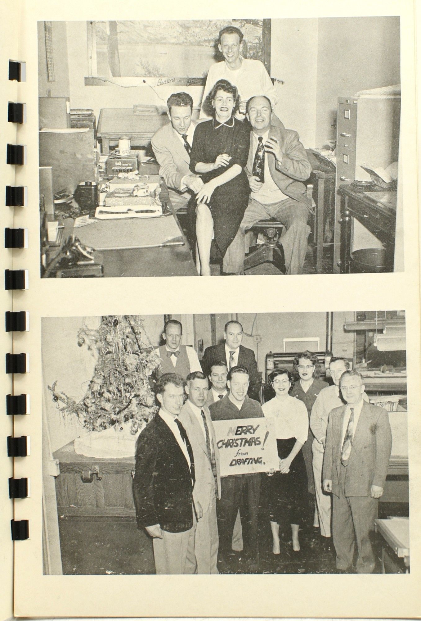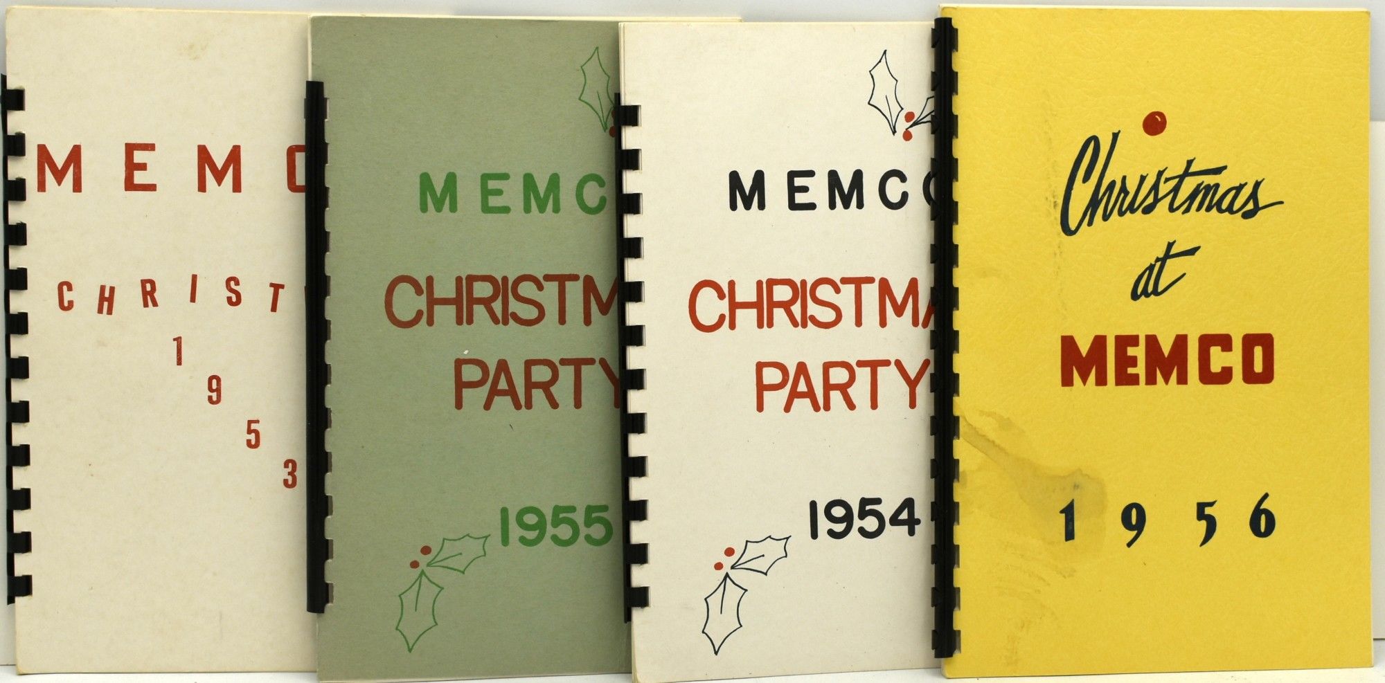 Self-published. Four 8vo; in comb bindings with printed card stock covers; each booklet approximately 8 pages printed only on the rectos, and with two photographs of Christmas jollity; other than the covers, there is no text.~~Though we would love to assert that these were from Memco Stores in Richmond (there were two of them in the 1960’s) we can not do so with confidence. The pictures look to be from a factory or manufacturing plant, and a big one given the number of employees at the parties. What we can say is that they are a picture of Baby Boomer life in the early 1950s -- the cigarettes, the women’s amazing dresses and corsages, the men’s neckties, the bottle of whisky in a man’s hand, the Christmas trees in every department, the women sitting in men’s laps,. Memco is tantalizing. And the Christmas party was a big enough deal that souvenir booklets were printed up. Certainly everyone seemed to be having a good time (or were they?).~~.