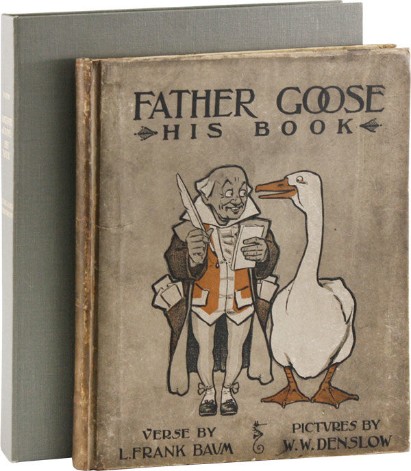 Father Goose was the first full-length collaboration between Baum and illustrator W.W. Denslow, who would go on to illustrate all of the Oz books during Baum's lifetime (Denslow had provided two illustrations to Baum's self-published book of poetry, The Candelabra's Glare, in 1898). The initial printing, completed at the end of September, 1899, was 5700 copies and quickly sold out, as the book became one of the surprise hits of the season, eventually selling more than a hundred thousand copies. There appeared, in rapid succession, six printings of between 10,000 and 30,000 copies each in each of the three months following the initial publication, and of course these secondary printings are the most often-encountered examples. An important title in Baum's non-Oz oeuvre, the first printing is exceedingly hard-to-find and especially uncommon in unrestored condition. Lacking the very scarce dustwrapper; housed in a custom cloth clamshell box. BIENVENUE & SCHMIDT p.169.