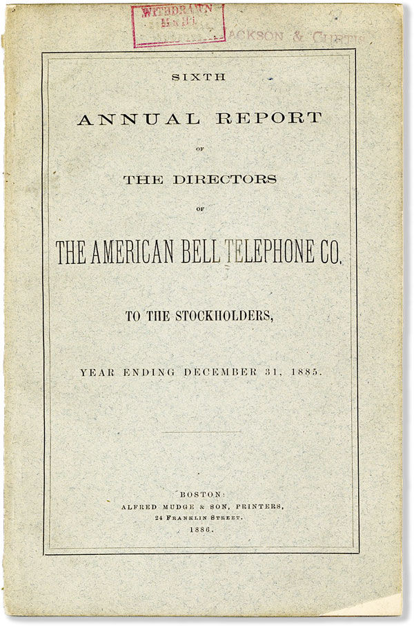 Discusses the early installation of telephone systems in the U.S., with details on company finances. The Americam Bell Telephone Company was formed in 1880 as a merger of the National Bell Telephone Company and the Ameerican Speaking Telephone company; later, it became the American Telephone & Telegraph Company (AT&T). Scarce, with no copies recorded in OCLC; and only one copy each of the 1882 and 1884 reports.