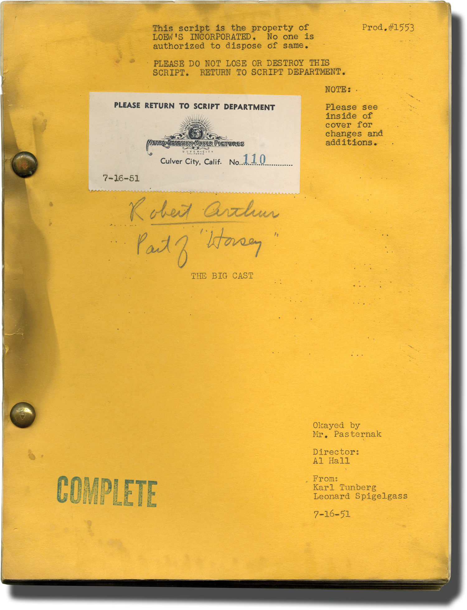 Beverly Hills, CA: Metro-Goldwyn-Mayer [MGM], 1951. Draft script for the 1952 film, here under the working title "The Big Cast." Nominated for an Academy Award. Copy belonging to Robert Arthur, with his name on the front wrapper in manuscript pencil.
