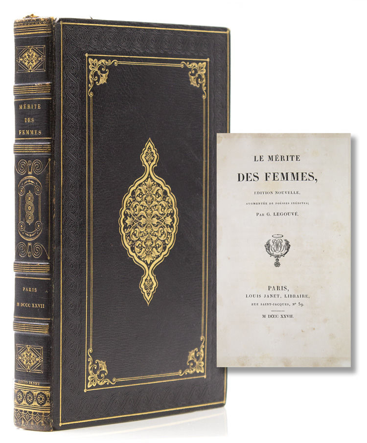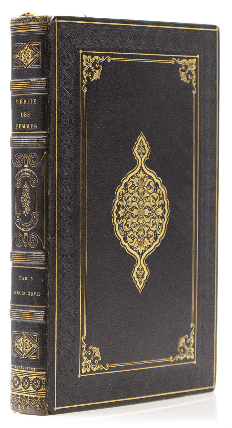Paris: Louis Janet, Libraire, 1827. Engraved title with vignette, 12 engraved plates. viii, [2], 405. 8vo. Contemporary French romantic binding of full black morocco, covers stamped in blind and gilt to panel design with central gilt-stamped medallion, spines with raised bands, compartments richly gilt or titled, signed at foot "Jouis Janet", a.e.g. Slight rubbing to spine ends, contents foxed and browned. Early gift inscription on half-title, bookplates. Engraved title with vignette, 12 engraved plates. viii, [2], 405. 8vo. A fine French romantic binding by the publisher and binder Louis Janet (1788-1840). Cf. Devauchelle II, p. 239