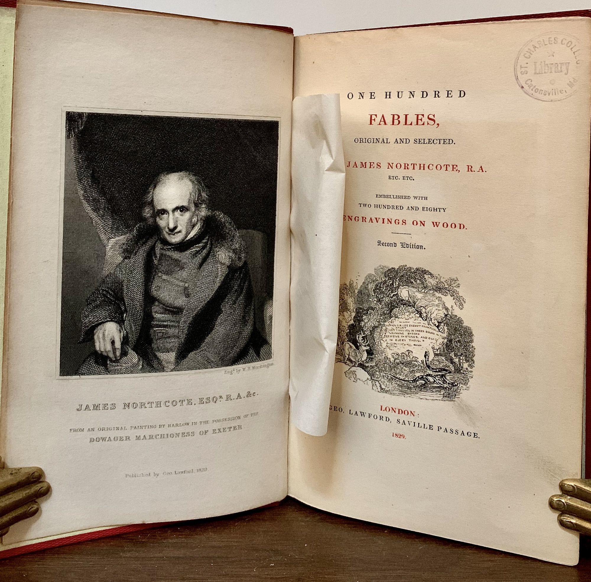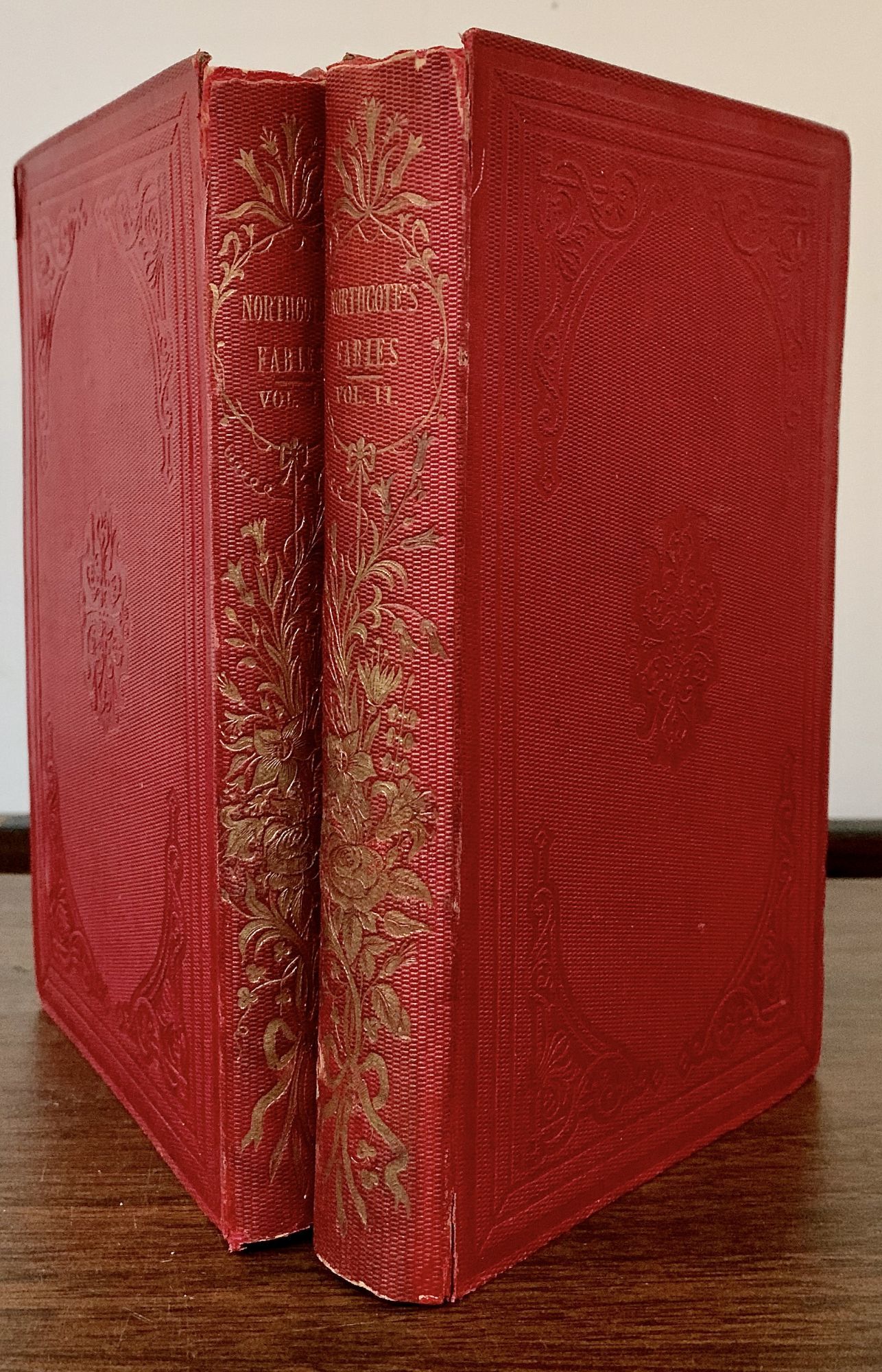 London: Geo. Lawford & John Murray, 1833. Second & First editions. Hardcover. Contemporary crimson cloth decorated in blind, backstrips elaborately decorated in floral gilt motifs. Very good. 2 Vols.. 272 , 248 pages. 20 x 12.5 cm. The illustrations, "the greater portion of which are of my own invention," with his headpiece designs for each one and with initial letters and tailpieces by William Harvey, pupil of Thomas Bewick." James Northcote was one of a number of prominent painters of the 18th century. Today Northcote is chiefly admired for his portraits, though his paintings of animals found favor in his lifetime. In his later years he devoted an increasing amount of time to history paintings, including some scenes from Shakespeare s history plays which were exhibited in Boydell s Shakespeare Gallery. The Second Series of the Fables was published posthumously, Both volumes with Index To The Engravings. Small owner stamp of Rev. J. Troy and small ex-library stamp top right corner of title page, interior contents fresh and bright, nicks to backstrip extremities.