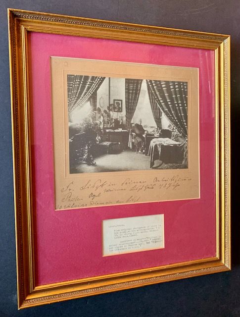 Weimar, Germany, 1886. Photograph. Very Good +. Impressive original photograph of Hungarian composer and pianist Franz Liszt (1811-1886) in his study, at his writing table, in Weimar, Germany. Handsome scarlet-red mount, decorative gilt-frame. Stamped in block on the photograph by Weimar photographer Louis Held and inscribed in the original matting by Liszt's long-time housekeeper Pauline Agel. The photo measures 7" x 10" and is clean and crisp, with a touch of light bleaching.