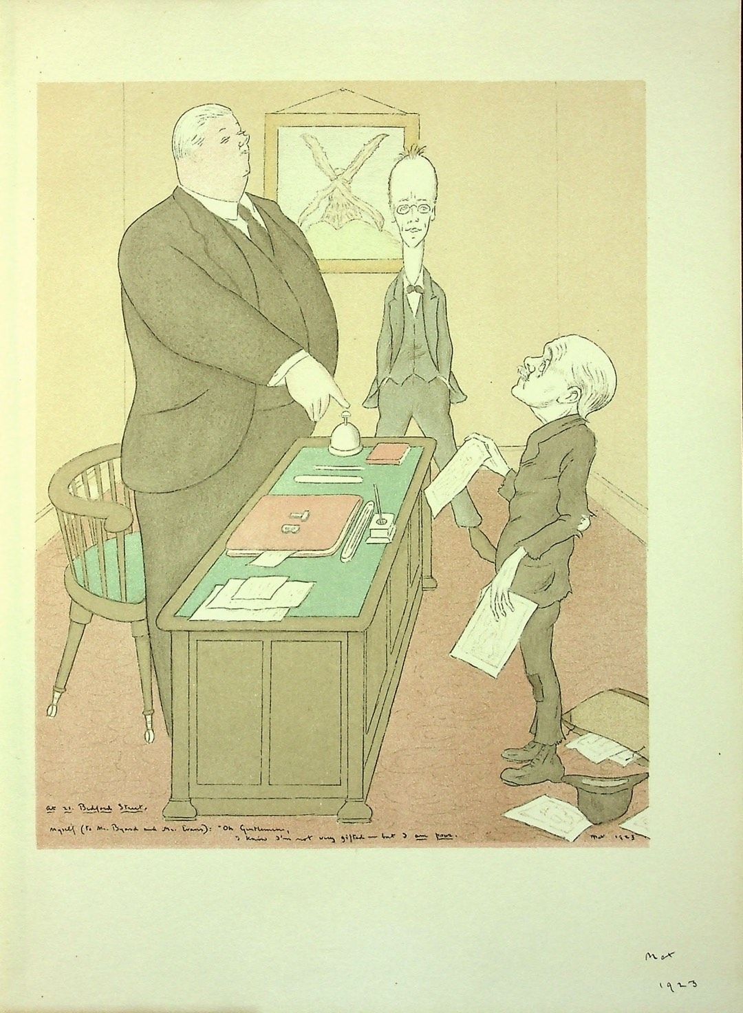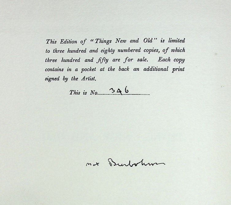 An album of caricatures in the typical Beerbohm style. The signed color plate in this copy is titled "At 21 Bedford Street