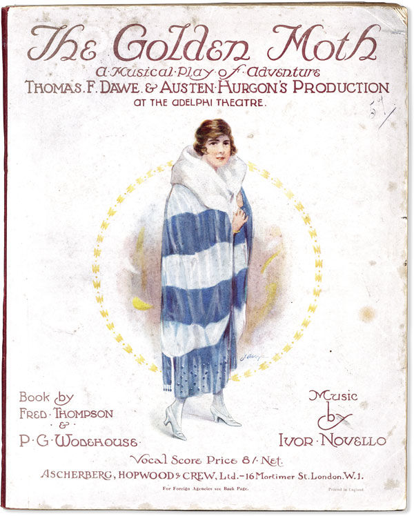 London: Ascherberg, Hopwood & Crew, Limited, [1921]. First Edition. Quarto (31cm); original pictorial wrappers, backed in maroon cloth; [viii],112,[4]pp. Rubber-stamped signature of Ivor Novello on lower title page. Modest wear and creasing, wrappers dust-soiled, with a few tiny nicks and creases to same, and a small ink notation and small stain to front cover; several creased corners in text, with the holograph addition in pencil of a second verso in "Lonely Soldier" on pp.24-25 (in an undetermined hand, though not Wodehouse's); complete, Very Good. A musical play co-written by Wodehouse and English author Frederick A. Thompson (1884-1949), with music by Welsh composer Ivor Novello. The Golden Moth premiered at the Adelphi Theatre in London on 5 October, 1921, running for 281 performances. An elusive Wodehouse item in the original wrappers; OCLC notes 12 holdings. McIlvaine Ga.5.