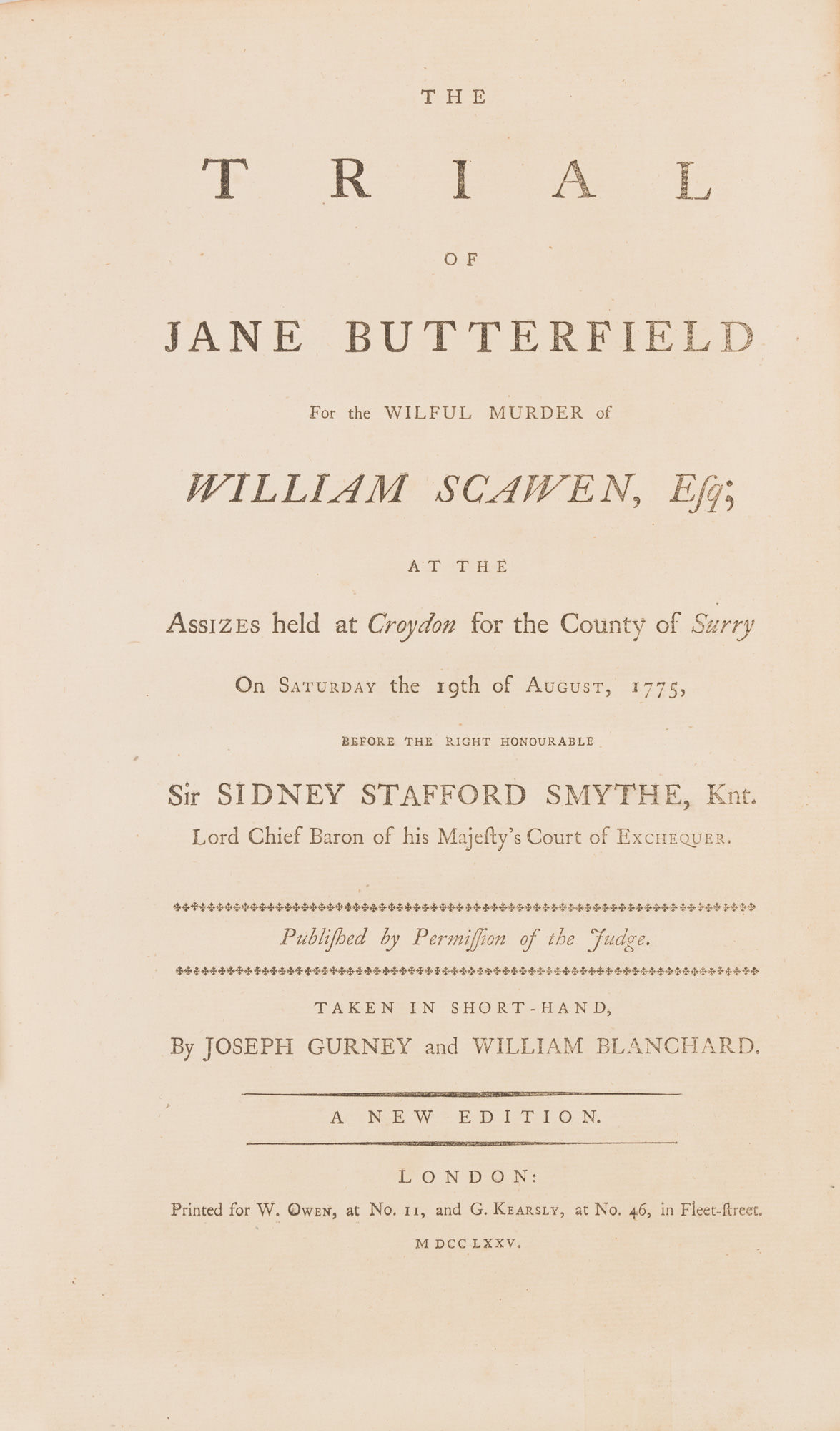1775. Accused of Poisoning Her Elderly Paramour [Trial]. Butterfield, Jane, Defendant. The Trial of Jane Butterfield for the Wilful Murder of William Scawen, Esq; At the Assizes Held at Croydon for the County of Surry on Saturday the 19th of August, 1775, Before the Right Honourable Sir Sidney Stafford Smythe, Knt. Lord Chief Baron of His Majesty's Court of Exchequer. London: Printed for W. Owen and G. Kearsly, 1775. [iv], 53, [1] pp. Folio (13-1/4" x 8-1/2"). Stab-stitched pamphlet bound into recent quarter calf over marbled boards, blind fillets to calf edge, lettering piece and blind fillets to spine. Moderate toning to interior, occasional light foxing, light soiling and cellotape repairs to edges of a few leaves without loss to text, light browning to first and final leaves. $750. * Only edition. Butterfield met Scawen, an elderly gentleman, when she was fourteen and was persuaded by a female accomplice to live with him as a kind of housekeeper-cum-mistress. When her father disowned her as a result, Scawen apparently had something of a crisis of conscience and promised to act as a new father to her. The two lived together quite happily, and when he grew ill, she became his devoted caretaker. When he died, his doctor, egged on by a suspicious maid, accused her of poisoning him in order to gain the inheritance he had supposedly left. The jury deliberated only ten minutes before acquitting Butterfield. English Short-Title Catalogue T93407.