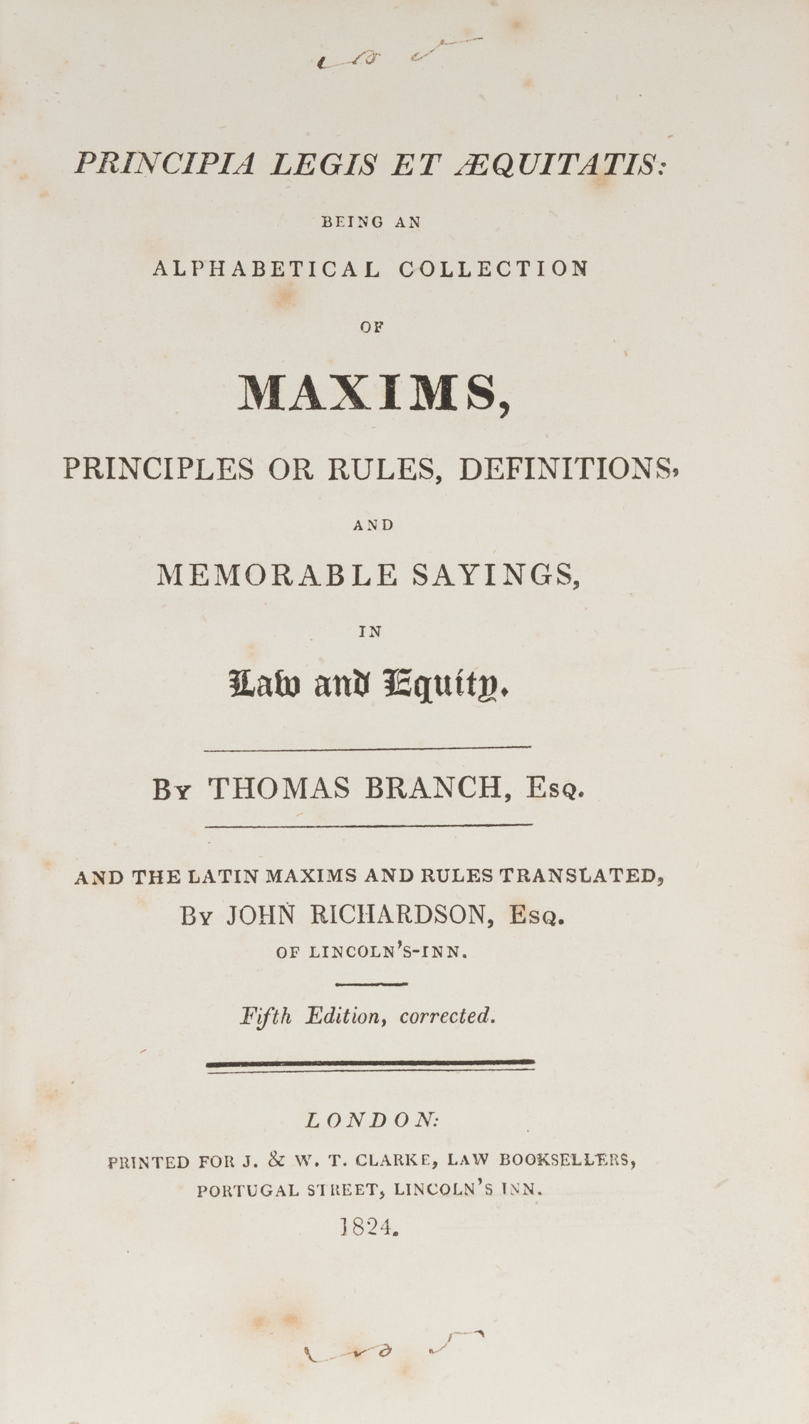 1824. London: J & W T Clarke, Lincoln's Inn, 1824 5th ed. London: J & W T Clarke, Lincoln's Inn, 1824 5th ed. Final Edition of Branch's Collection of Legal Maxims Branch, Thomas [fl. 1738-1753]. Richardson, John, Translator. Principia Legis et Aequitatis: Being an Alphabetical Collection of Maxims, Principles or Rules, Definitions, and Memorable Sayings in Law and Equity. And the Latin Maxims and Rules Translated. Fifth Edition, Corrected. London: Printed for J. & W.T. Clarke, 1824. [viii], 244 pp. Octavo (7" x 4-1/4"). Contemporary three quarter calf over marbled boards, lettering piece and gilt fillets to spine. Light rubbing to boards, moderate rubbing to extremities with light wear to spine ends and corners, a few shallow scuffs and minor nicks to spine, hinges cracked, two early bookplates to front pastedown (of James Barratt, Lymm Hall and Charles J. Bewlay, Carleton Hall). Moderate toning to interior, light foxing in a few places, annotations in miniscule early hand to a few passages and title page. $750. * Fifth and final edition. This popular book was first published in 1753. (The first edition by Richardson, the fourth, was published in 1822.) According to Marvin, "'As a manual, this little book contains more law and more useful matter, than any one book of the same size which can be put into the hands of the student.' It is more extensive than Noy's Maxims, and 'draws so copiously from the common law reports and writers of the age of Elizabeth, and since that time, that it may be regarded as the accumulated spirit and wisdom of the great body of the English law.'" Marvin's first quote is from Preston on Abstracts, the second from Kent's Commentaries on American Law. James Barratt [d.1869] of Lymm Hall, Cheshire, and later of Carleton Hall, Cumberland, was a landowner and solicitor. Better known for his interest in landscape architecture, he commissioned leading landscape architect Edward Kemp to design his rose garden at Lymm. Marvin, Legal Bibliography 143.