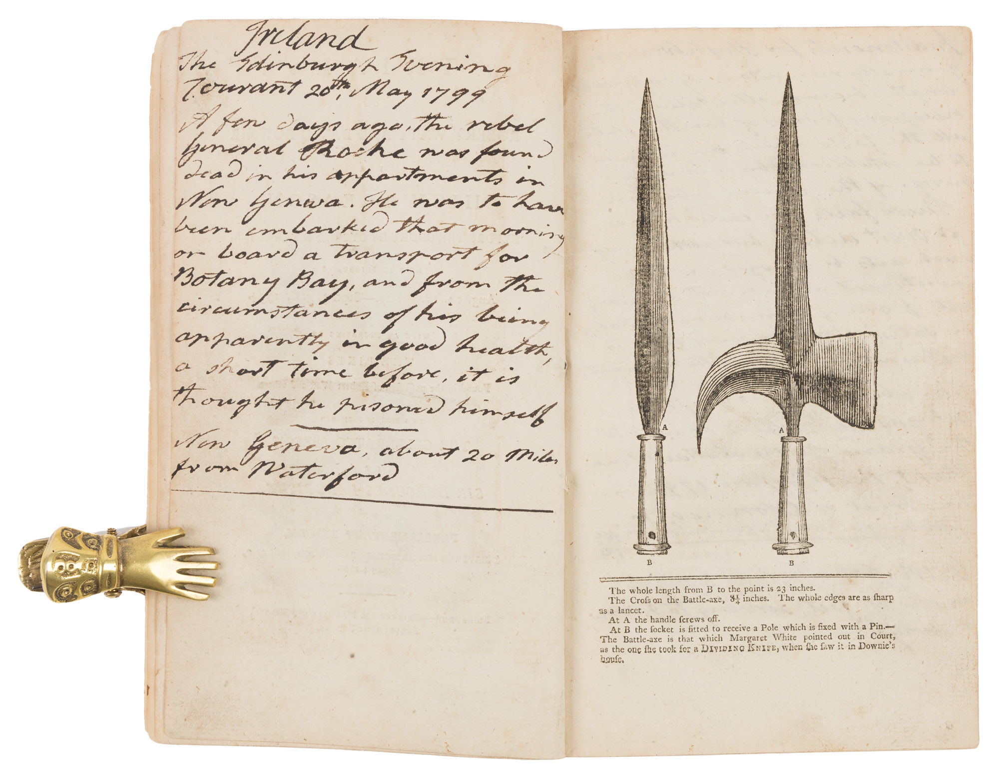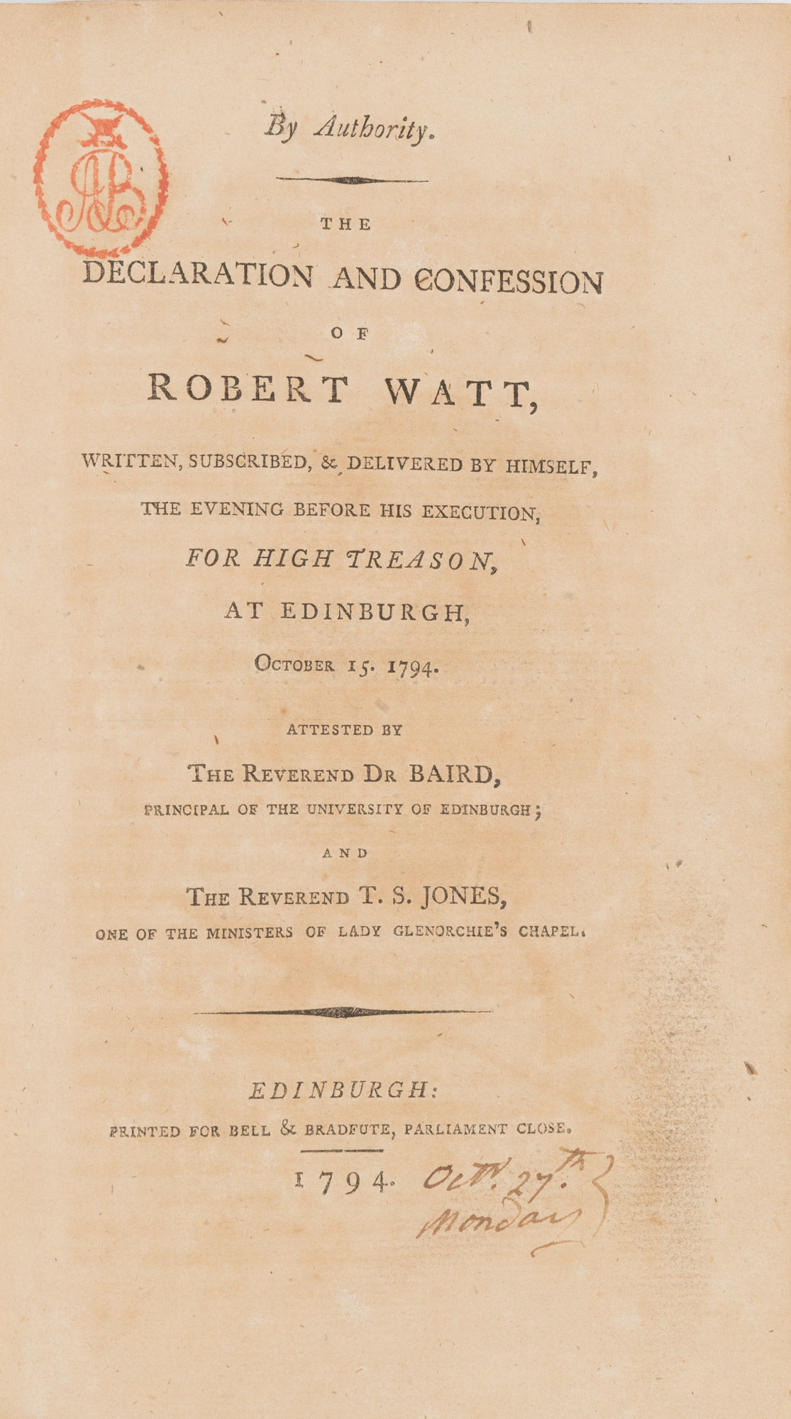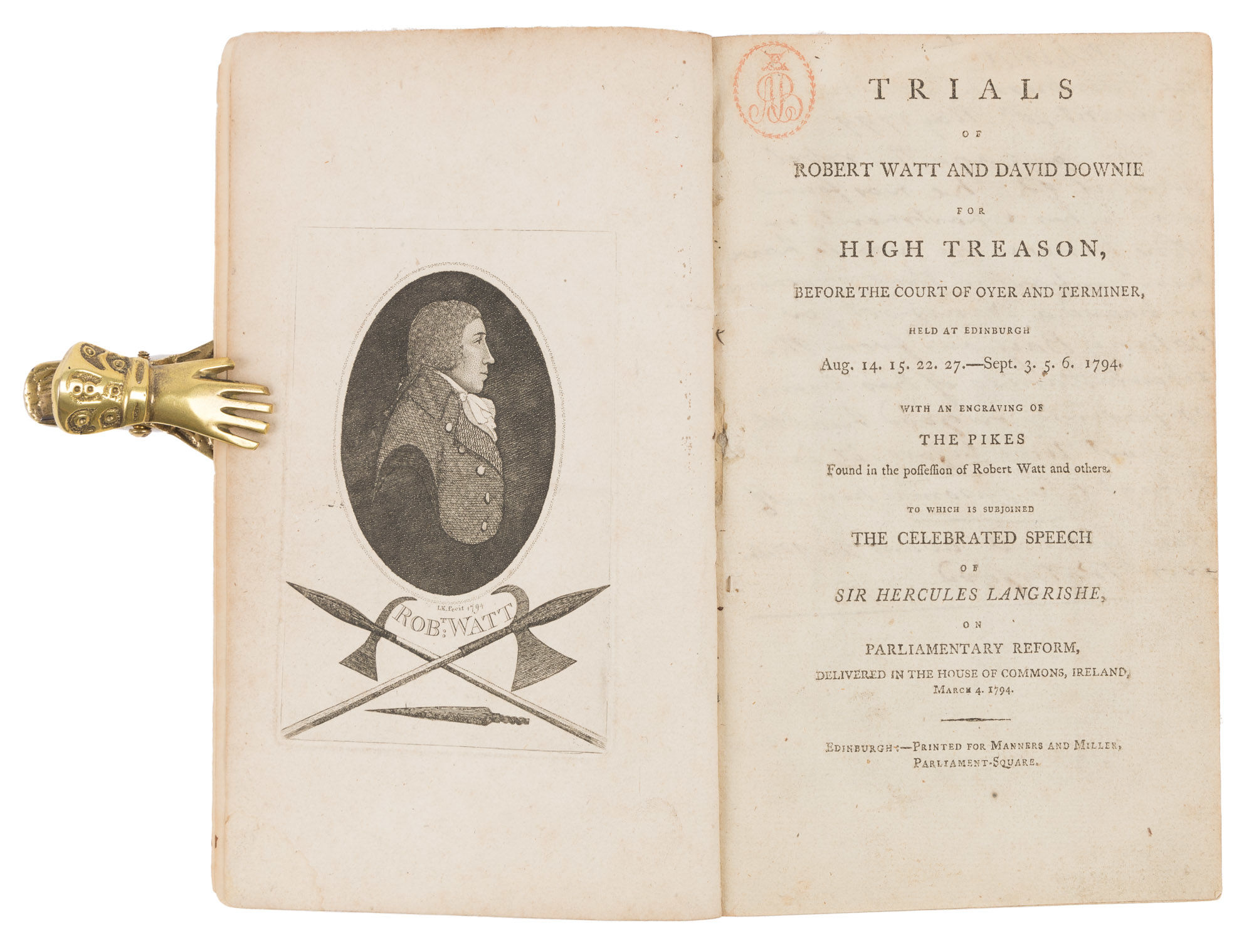 1794. The Trial and Confession of a Scottish Traitor [Trials]. [Scotland]. Watt, Robert, Defendant [c.1761-1794]. Trials of Robert Watt and David Downie for High Treason, Before the Courts of Oyer and Terminer, Held at Edinburgh Aug. 14. 15. 22. 27.-Sept. 3. 5. 6. 1794. With an Engraving of the Pikes Found in the Possession of Robert Watt and Others. To Which is Subjoined the Celebrated Speech of Sir Hercules Langrishe, On Parliamentary Reform, Delivered in the House of Commons, Ireland, March 4. 1794. Edinburgh: Printed for Manners and Miller, [1794]. [4], 92 pp. With a woodcut illustration after title page. [Bound with] Watt, Robert. By Authority. The Declaration and Confession of Robert Watt, Written, Subscribed, & Delivered by Himself, The Evening Before His Execution, For High Treason, At Edinburgh, October 15. 1794. Attested by the Reverend Dr Baird, Principal of the University of Edinburgh; And the Reverend T.S. Jones, One of the Ministers of Lady Glenorchie's Chapel. Edinburgh: Printed for Bell & Bradfute, 1794. iv, [35], [1] pp. With a lithograph portrait frontispiece, moved to beginning of Trials by binder. Publisher advertisement to final page. Octavo (8" x 4-3/4"). Disbound stab-stitched pamphlets. Light toning to interior, more moderate in some places, light soiling in a few places, red monogram stamp ("AB") to upper gutter of title pages and p. [1] of Trials, ms. notes in an early hand to versos of first two leaves of Trials and to foot of title page of Confession. $650. * Only editions. Watt, a wine merchant and political radical, was the architect of a somewhat confused plot to establish Scotland as an independent country. After a search of his house turned up a number of pikes and the type for a seditious handbill, he was arrested and tried for treason. Downie, a co-conspirator, was pardoned, but Watt was not so lucky. He was convicted and sentenced to be hanged and beheaded despite the jury's recommendation of mercy. The sentence reflected the courts' opinion of the severity of Watt's crime. It was also intended to be a warning to other radicals. English Short-Title Catalogue T174262, T94672.
