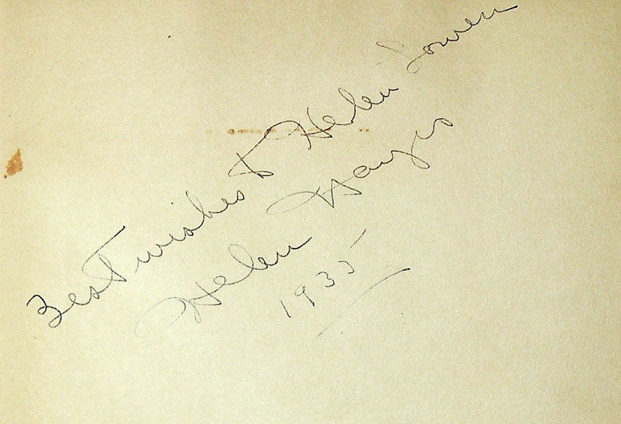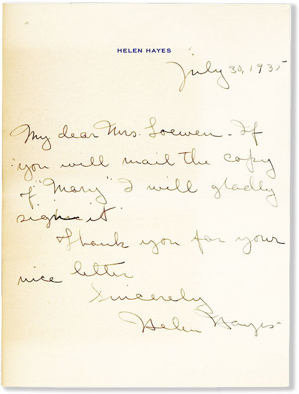 This copy inscribed on the front endpaper by Helen Hayes, who debuted the role of Mary in the play's 1933 premiere. The inscription, to a Helen Loewen, is dated 1935. Additionally, there is a laid-in signed note on Hayes' personal stationery, agreeing to sign the book. The play premiered on November 27, 1934 at the Alvin Theater in New York and was later the basis for the 1936 John Ford film of the same title, starring Katharine Hepburn in the role of Mary.