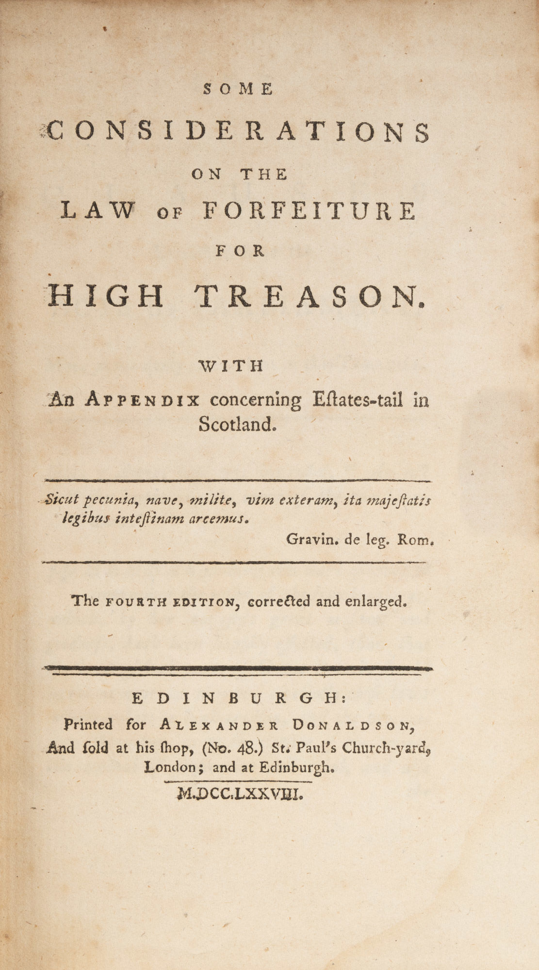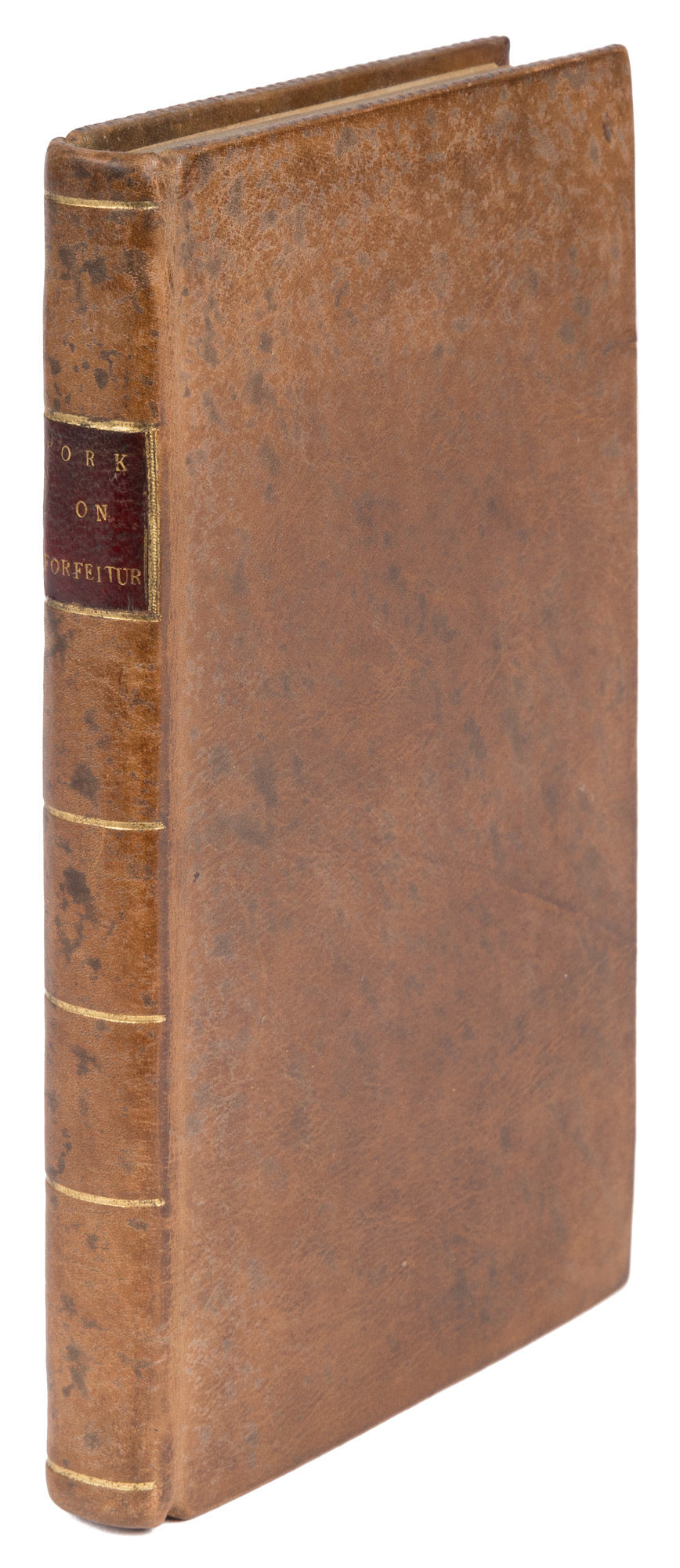 1778. Forfeiture for High Treason [Yorke, Charles (1722-1770)]. Some Considerations on the Law of Forfeiture for High Treason. With an Appendix Concerning Estates-Tail in Scotland. Corrected and Enlarged. Eduinburgh: Printed for Alexander Donaldson, 1778. xiv, 189, [1] pp. 12mo. (6-1/2" x 4"). Recent period-style sprinkled calf, gilt fillets and retained contemporary lettering piece to spine, blind tooling to board edges, hinges mended. Moderate toning, faint dampstaining to lower outside corner of text block, light foxing in a few places. An attractive copy. $250. * Fourth (stated) edition, published the same year as the third edition, which was printed in London. First published in 1745, Yorke's essay argues that corruption of blood and forfeiture are justifiable consequences of treason. This work was a response to the cases of treason that followed the Jacobite Rebellion of 1745 and a defense of treason legislation introduced by Yorke's father, the Earl of Hardwicke, who was then lord chancellor. Going beyond the common law, Yorke draws on examples from Athenian, Roman, Jewish and feudal sources. The final edition of this book, the fourth, was published in 1795. All editions are scarce. English Short-Title Catalogue N23002.