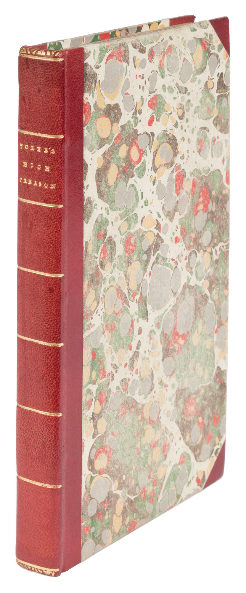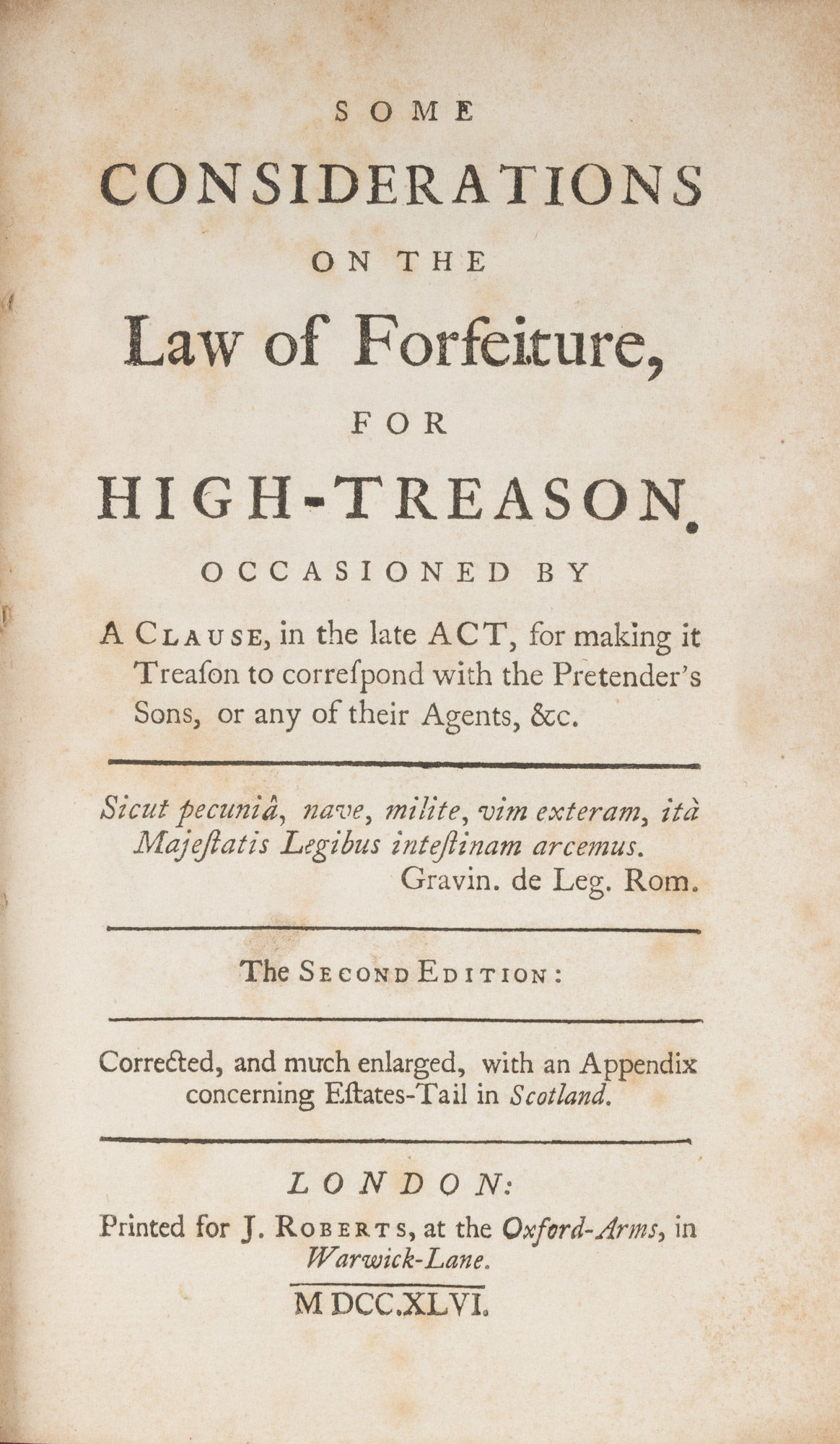 1778. Forfeiture for High Treason [Yorke, Charles (1722-1770)]. Some Considerations on the Law of Forfeiture, For High-Treason. Occasioned by a Clause, In the Late Act, For Making it Treason to Correspond with the Pretender's Sons, Or Any of Their Agents, &c. Corrected, And Much Enlarged, With an Appendix Concerning Estates-Tail in Scotland. London: Printed for J. Roberts, 1746. viii, [6], 24, *23-*24, 25-28, *27-*28, 29-112, *111-*112, 113-180, [2] pp. Pagination irregular, text complete. Octavo (7-3/4" x 4-3/4"). Recent period-style three-quarter calf over marbled boards, lettering piece and gilt fillets to spine, gilt tooling to spine ends, endpapers renewed. Moderate toning to text, light foxing in a few places. An attractive copy. $250. * Second edition. First published in 1745, Yorke's essay argues that corruption of blood and forfeiture are justifiable consequences of treason. This work was a response to the cases of treason that followed the Jacobite Rebellion of 1745 and a defense of treason legislation introduced by Yorke's father, the Earl of Hardwicke, who was then lord chancellor. Going beyond the common law, Yorke draws on examples from Athenian, Roman, Jewish and feudal sources. The final edition of this book, the fourth, was published in 1795. All editions are scarce. English Short-Title Catalogue T728.