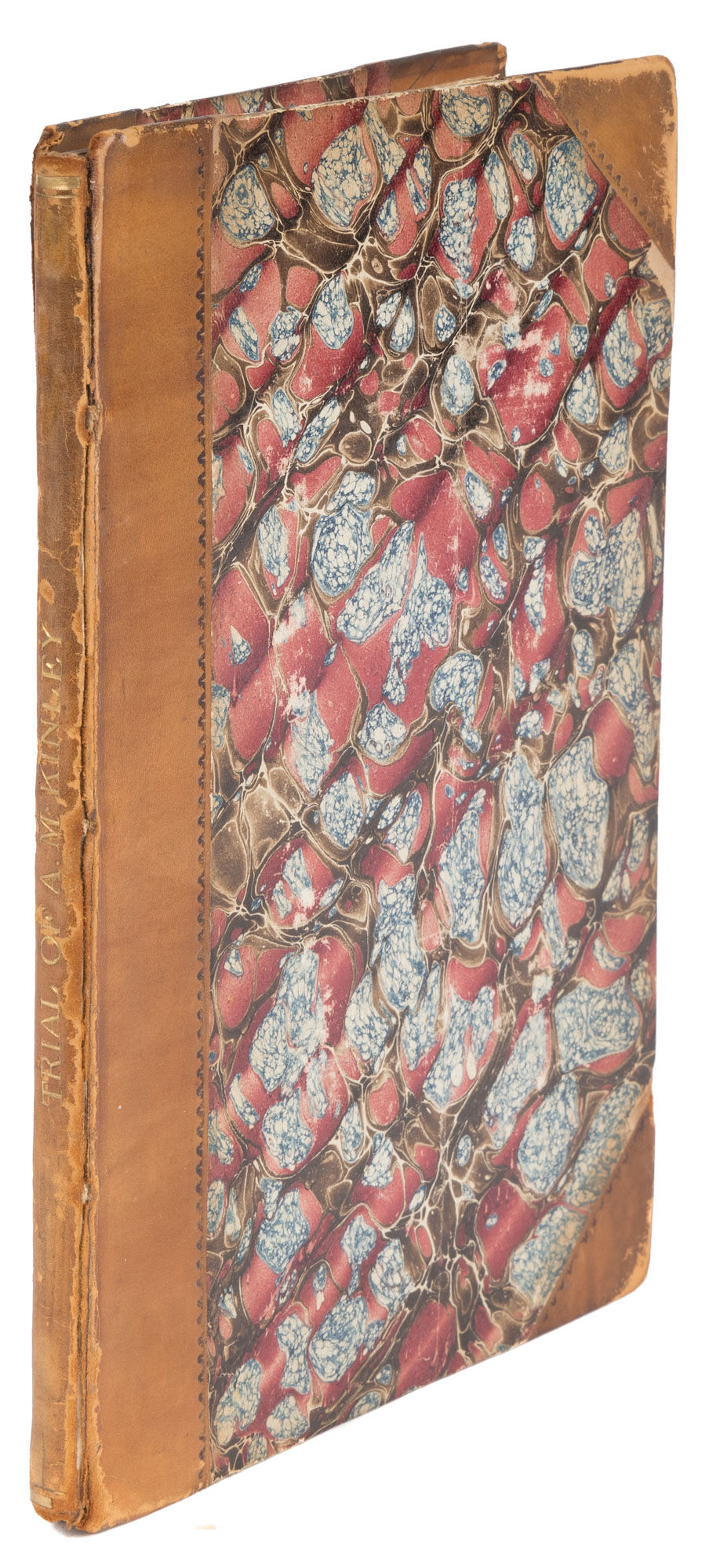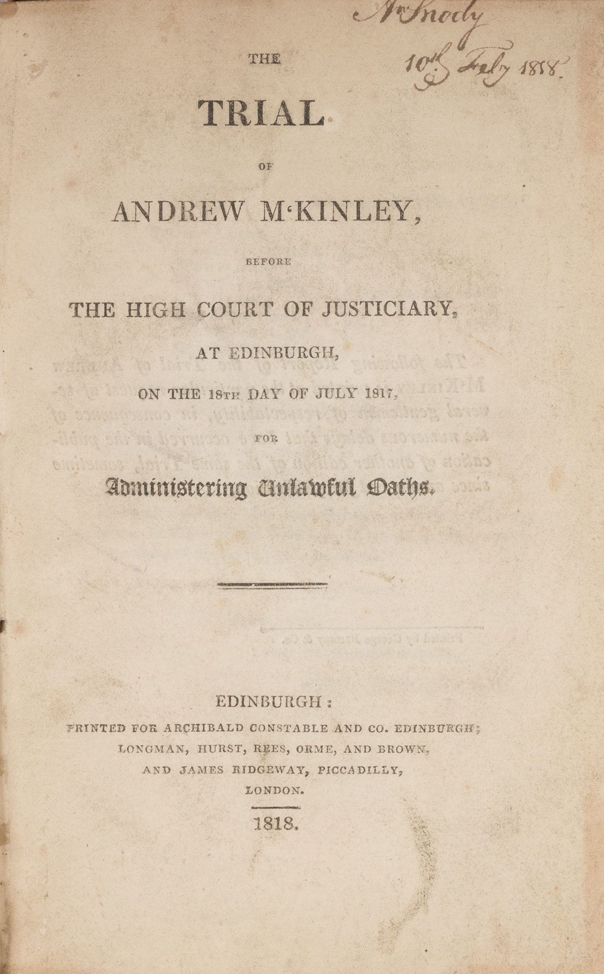 1818. Edinburgh: Printed for Manners and Miller, 1818.. Edinburgh: Printed for Manners and Miller, 1818. "For Administering Unlawful Oaths" [Trial]. McKinley, Andrew [1799-1817], Defendant. The Trial of Andrew McKinley, Before The High Court of Justiciary, At Edinburgh, On the 18th Day of July, 1817, For Administering Unlawful Oaths. Edinburgh: Printed for Manners and Miller, 1818. [iv], 70 pp. Octavo (7-3/4" x 5"). Stab-stitched pamphlet in near-contemporary three-quarter calf over marbled boards, gilt title to spine. Moderate rubbing to extremities with some wear to spine ends and corners, front hinge cracked, rear board separating but secure, front hinge mended, later owner bookplate (of Norman and Janey Buchan) to front pastedown. Light browning to interior, light soiling to p. 70 and title page, which has an owner signature (of Andrew Snody, likely Andrew Snody SSC [c.1795-1881]) dated 1858 to the upper outside corner. $650. * Only edition. Intended to suppress radicalism, the Unlawful Oaths Act of 1812 (c.104. 52 Geo. 3) prescribed the death penalty for anyone guilty of "administering of any oath or engagement, purporting or intending to bind the person taking the same to commit any treason or murder, or any felony, punishable by law with death." McKinley was tried under this act, and ultimately acquitted, for his role in an unsuccessful 1817 labor uprising, one of many instigated by the economic depression that followed the Napoleonic Wars. These uprisings culminated in the Cato Street Conspiracy and Radical War, or Scottish Insurrection, a week of strikes and unrest in Scotland, England and Ireland. OCLC locates 6 copies, 1 in North America (University of Pennsylvania Law School). Catalogue of the Library of the Harvard Law School (1909) II:1137.