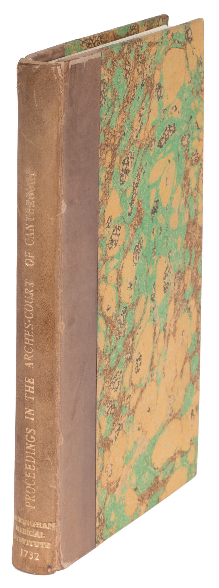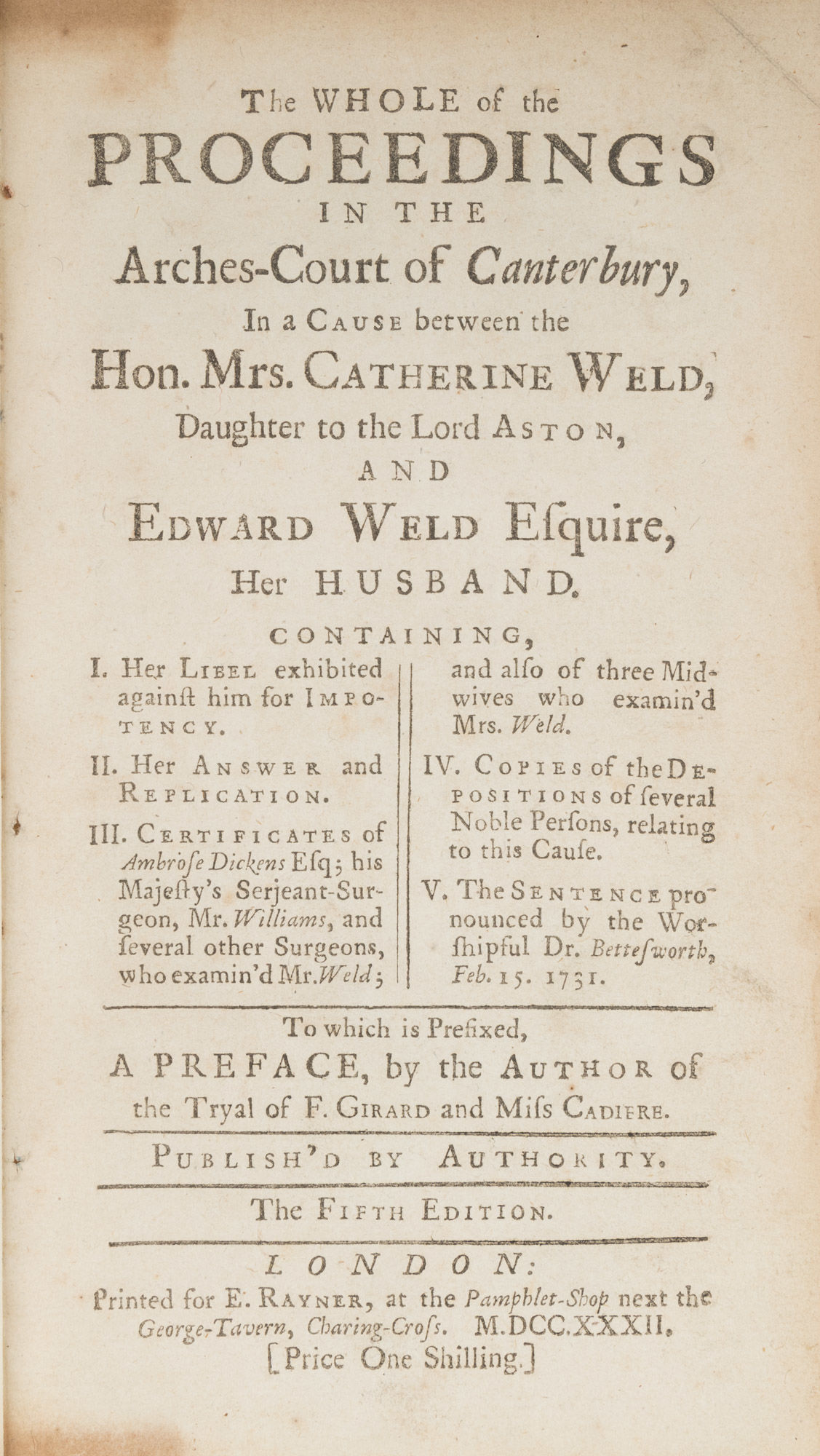 1732. London: Printed for E. Rayner, 1732. London: Printed for E. Rayner, 1732. "Unable to Perform the Conjugal Rites" [Trial]. Weld v. Weld. The Whole of the Proceedings in the Arches-Court of Canterbury, In a Cause Between the Hon. Mrs. Catherine Weld, Daughter to the Lord Aston, And Edward Weld Esquire, Her Husband. Containing, I. Her Libel Exhibited Against Him for Impotency. II. Her Answer and Replication. III. Certificates of Ambrose Dickens Esq; His Majesty's Serjeant-Surgeon, Mr. Williams, And Several Other Surgeons, Who Examin'd Mr. Weld; And Also of Three Midwives who Examined Mrs. Weld. IV. Copies of the Depositions of Several Noble Persons, Relating to this Cause. V. The Sentence Pronounced by the Worshipful Dr. Bettesworth, Feb. 15. 1731. To Which is Prefixed a Preface, By the Author of the Tryal of F. Girard and Miss Cadiere. London: Printed for E. Rayner, 1732. 48 pp., leaves B3 and B4 (pp. 13-16) misnumbered 9-12. Octavo (7-1/2" x 4-1/2"). Stab-stitched pamphlet bound into later quarter calf over marbled boards, gilt title and date to spine, a number of blank leaves added by binder after p. 48. Light rubbing to extremities, front joint just starting at ends. Light toning to interior, occasional light foxing, light soiling in a few places, slight offsetting to preliminaries and first two leaves. $750. * Fifth and final edition. The Welds married in 1727, but when there was no issue after three years, Catherine sued Edward for divorce in ecclesiastical court on the grounds that he was "unable to perform the Conjugal Rites, by Reason of some natural Imperfection which he well knew in himself." Edward fought to clear his name, claiming that after a simple surgical procedure he had, in fact, consummated the marriage twice. The case gained a great deal of public attention, largely because the detail of Catherine's claim and the amount of medical evidence presented were unusual even for an impotency trial. Ultimately, the divorce was denied and the couple reached a private resolution to live apart. Edward remarried after Catherine's death and successfully produced a daughter and four sons. English Short-Title Catalogue T52462.