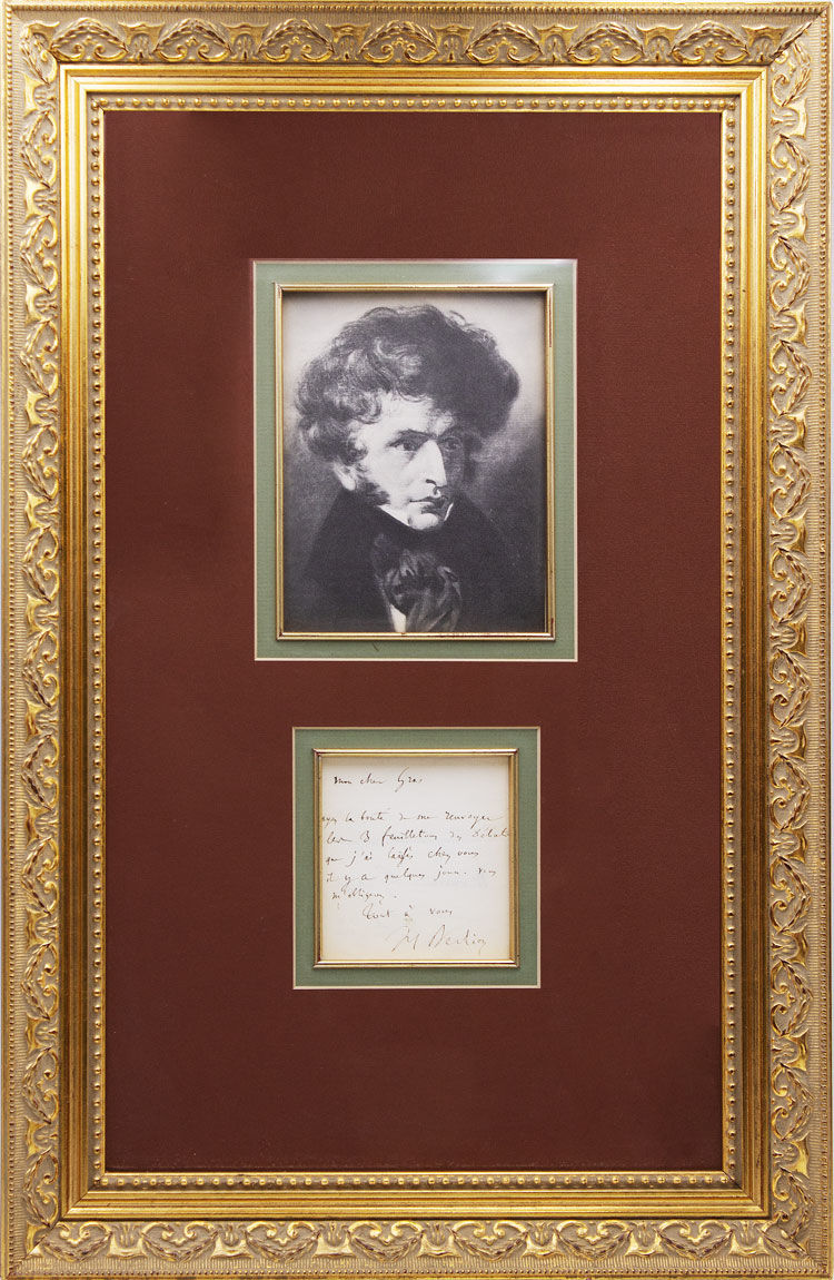 np, nd. 1 page, pen and ink on paper. 12mo (3-3/8 x 3-1/8 inches visible). Framed in gilt frame. 1 page, pen and ink on paper. 12mo (3-3/8 x 3-1/8 inches visible). [In translation:] "Have the courtesy to send me the three articles on the debates that I left at your house a few days ago …" M. Gras is perhaps a relation to soprano Julie Dorus-Gras, who performed as Teresa in the premier Berlioz' opera Benvenuto Cellini.