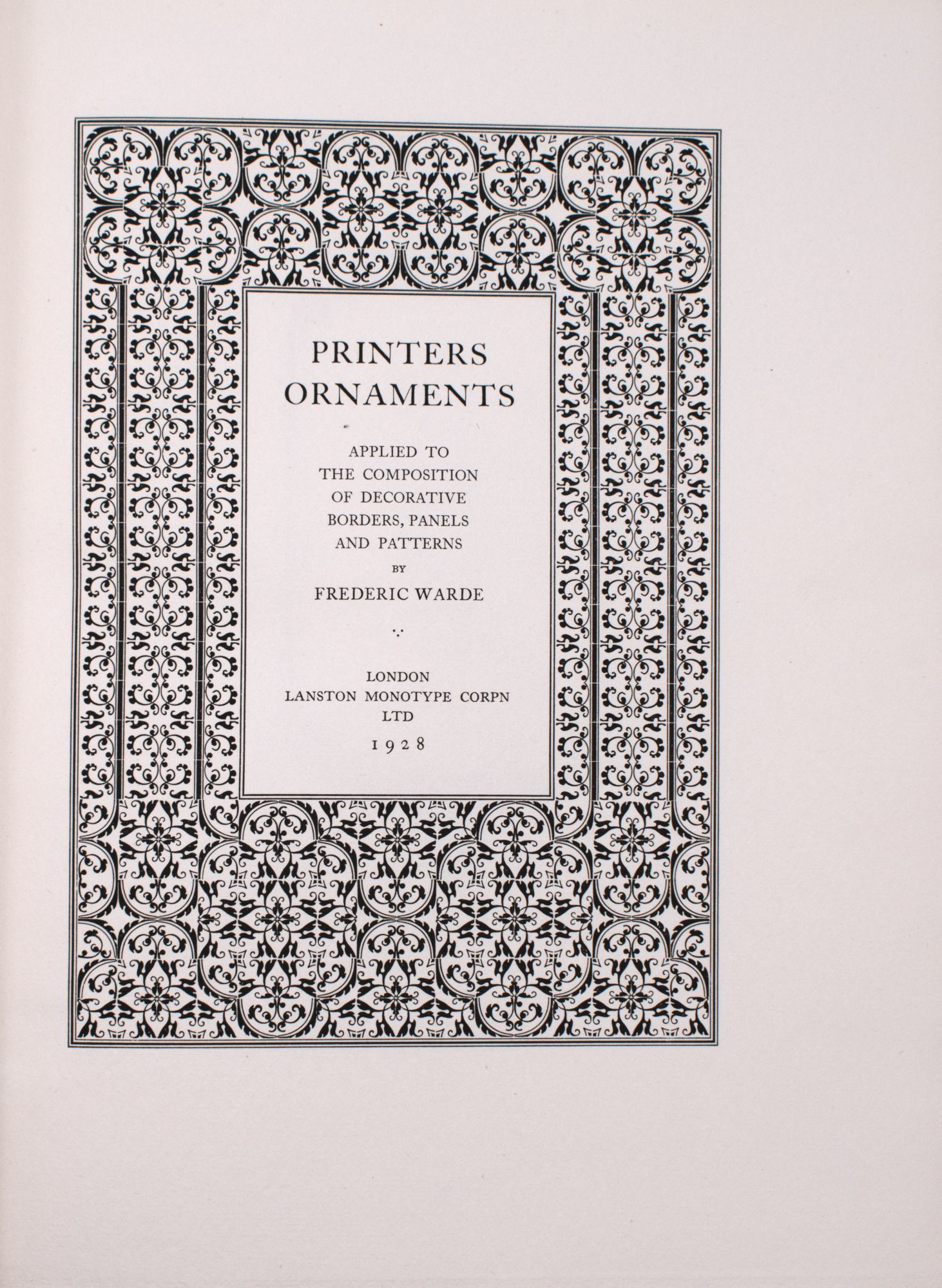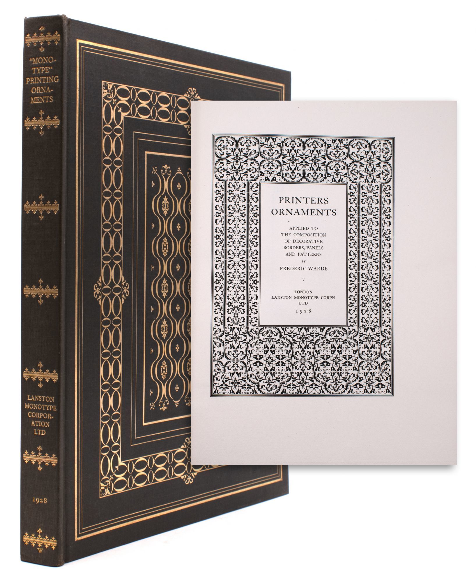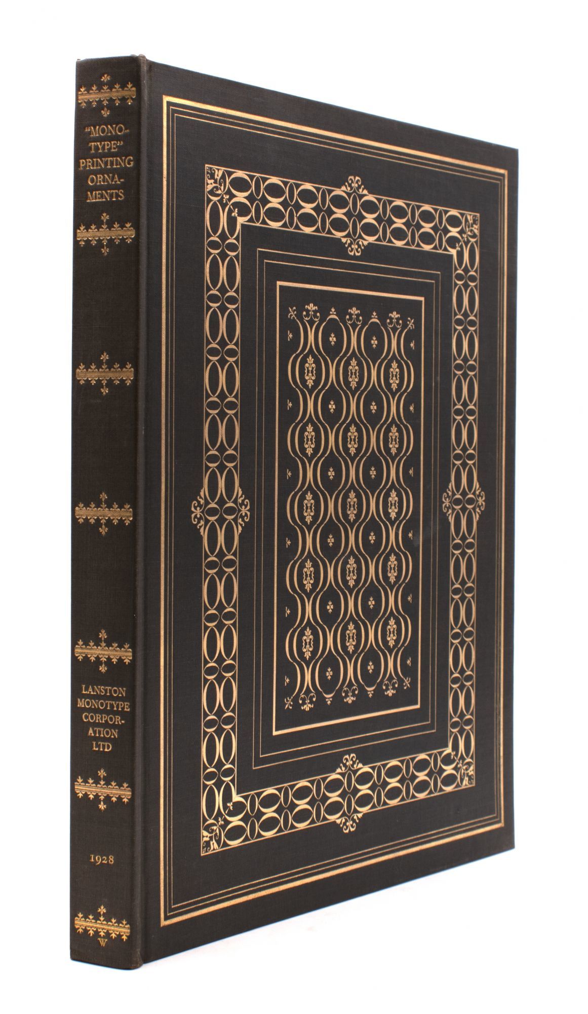 London: Lanston Monotype Corpn Ltd, 1928. First Edition. Deluxe issue on handmade paper. Illustrated throughout with elaborate ornamental borders. 19 pages of ornaments printed on thick colored paper. 1 vols. 4to. Original black cloth, gilt extra. Fine. Randeria bookplate. First Edition. Deluxe issue on handmade paper. Illustrated throughout with elaborate ornamental borders. 19 pages of ornaments printed on thick colored paper. 1 vols. 4to.