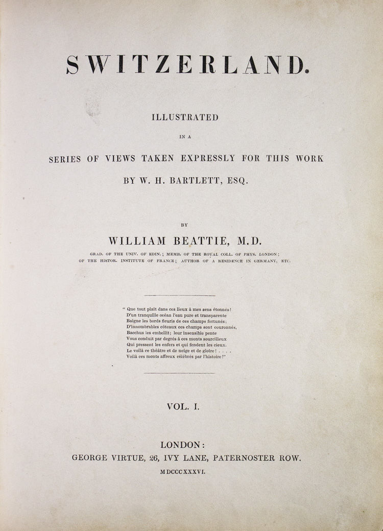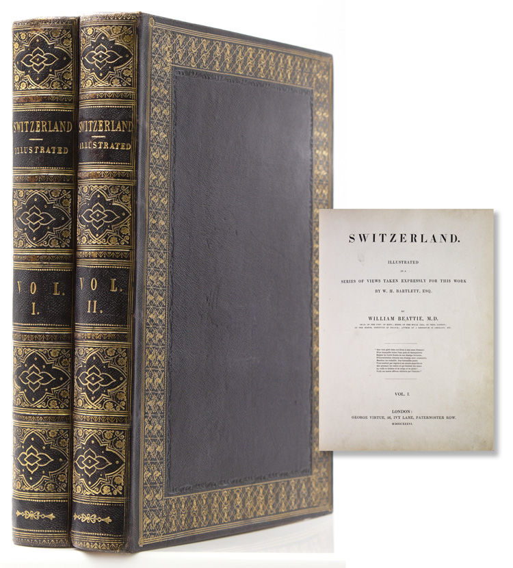 London: George Virtue, 1836. First edition. Engraved titles in each volume (a little foxed), 106 steel-engraved plates (very clean) after Bartlett, fold. lithographic map of Switzerland at back of Vol. II. 2 vols. 4to. Bound in full contemporary purple morocco, a.e.g. Fine. First edition. Engraved titles in each volume (a little foxed), 106 steel-engraved plates (very clean) after Bartlett, fold. lithographic map of Switzerland at back of Vol. II. 2 vols. 4to. Ray, England, 65; "The heyday of engraving on steel was the second quarter of the nineteenth century. . . . The indefatigable Bartlett was the chief producer of volumes of steel-engraved views. For many years he ranged through two continents making or collecting drawings. . . . Collectors not seeking representations of familiar scenes will probably find the grandeur of his Swiss subjects most appealing" (Ray, Illustrator & the Book in England, pp. 40-42)