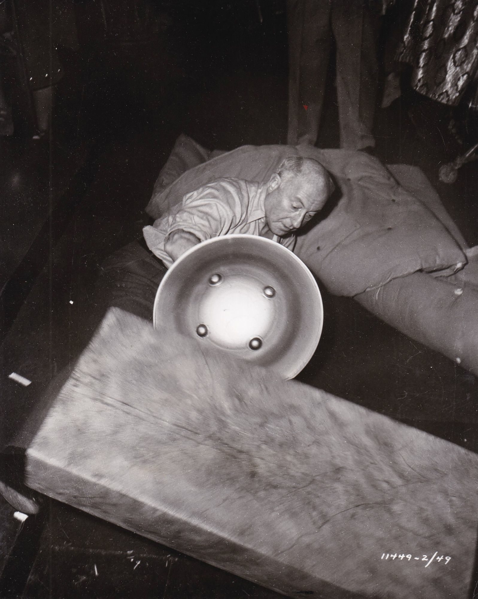 Los Angeles: Paramount Pictures, 1949. Vintage borderless reference photograph of director Cecil B. DeMille adjusting a light on the set of the 1949 film. Mimeo snipe on the verso, along with a date stamp reading 1949 SEP 21 7:00.
