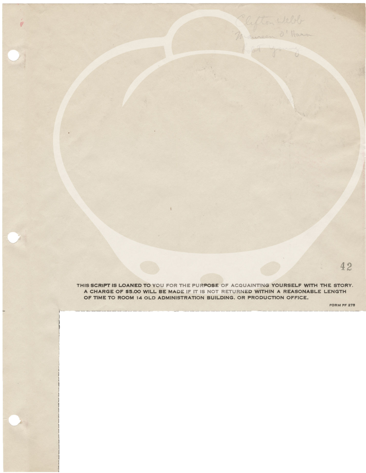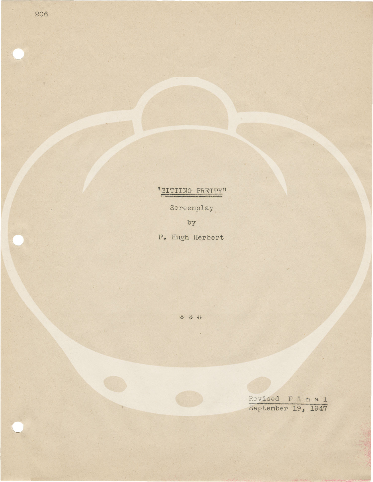 Red titled wrappers, noted as REVISED FINAL on the front wrapper, rubber-stamped copy No. 42 and production No. 206, dated SEPT. 19, 1947. Distribution page present, with receipt removed. Title page present, dated September 19, 1947, noted as Revised Final, with credits for screenwriter F. Hugh Herbert. 141 leaves, with last page of text numbered 139. Mimeograph duplication, rectos only. Pages Very Good plus, wrapper Very Good plus, bound internally with three gold brads.